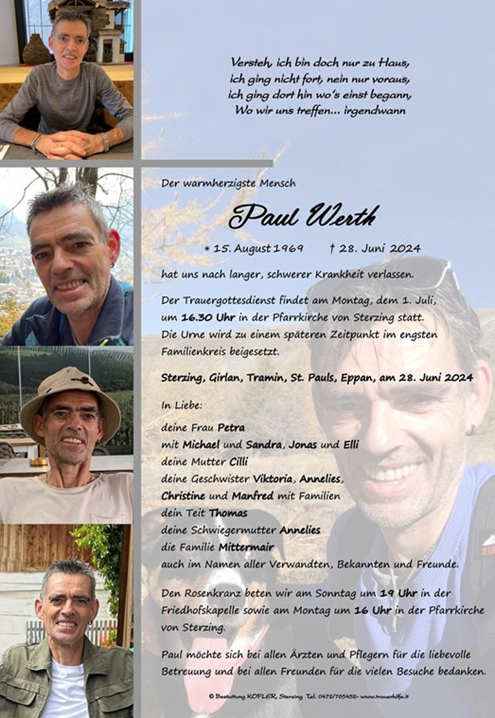 Den Trauergottesdienst feiern wir am Montag, dem 1. Juli, um 16.30 Uhr in der Pfarrkirche von Sterzing statt. Die Urne wird zu einem späteren Zeitpunkt im engsten Familienkreis beigesetzt.