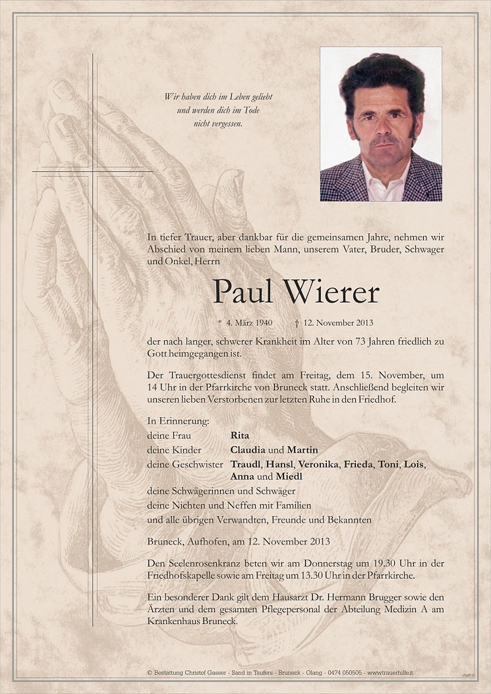 14 Uhr in der Pfarrkirche von Bruneck statt. Anschließend begleiten wir unseren lieben Verstorbenen zur letzten Ruhe in den Friedhof.