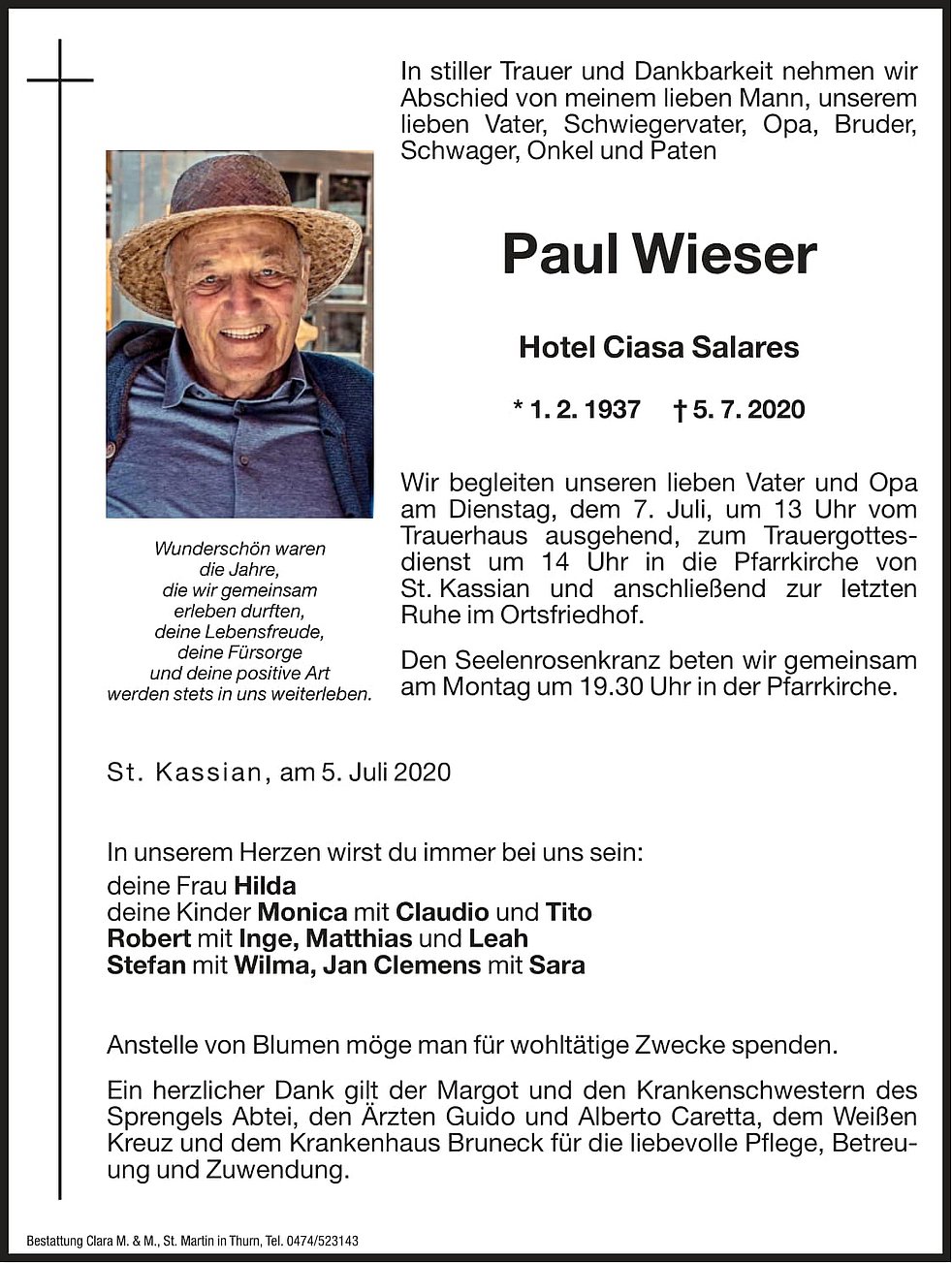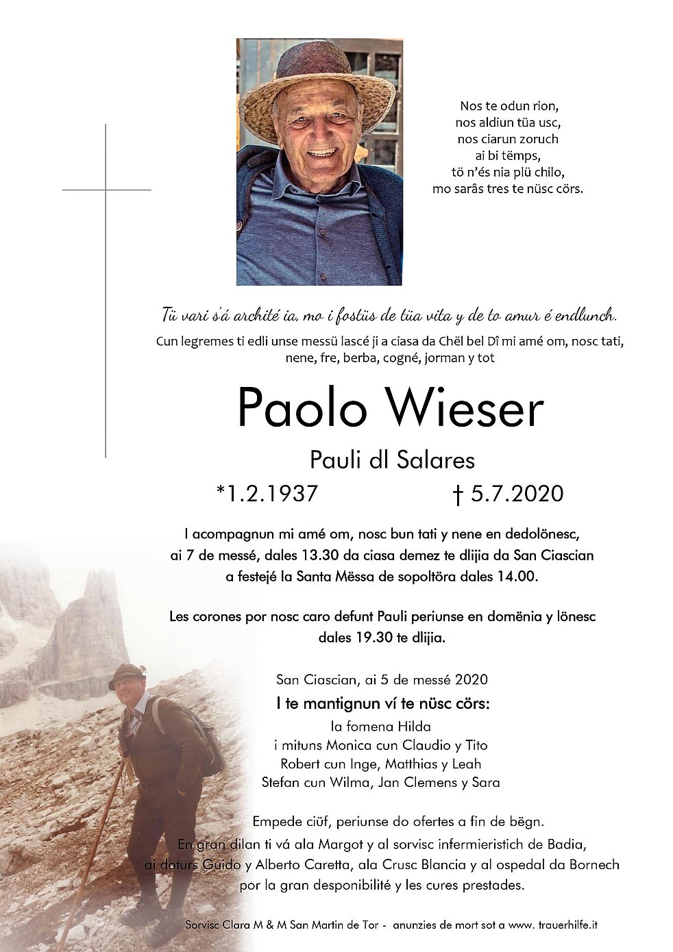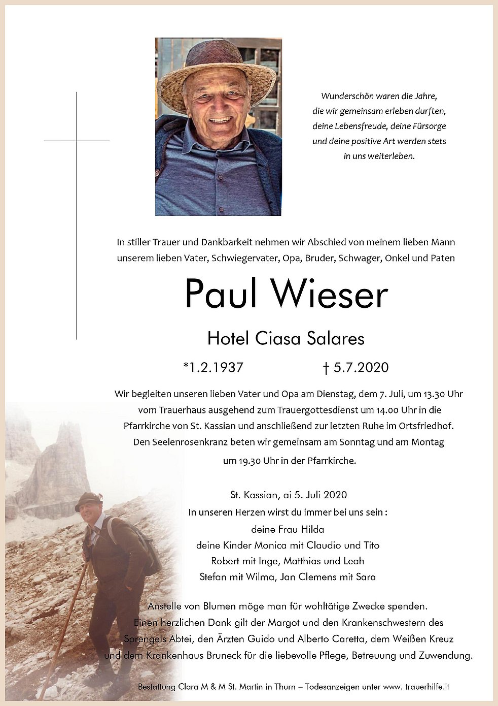 Wir begleiten unseren lieben Vater und Opa am Dienstag, dem 7. Juli, um 13.30 Uhr vom Trauerhaus ausgehend zum Trauergottesdienst um 14.00 Uhr in die Pfarrkirche von St. Kassian und anschließend zur letzten Ruhe im Ortsfriedhof.