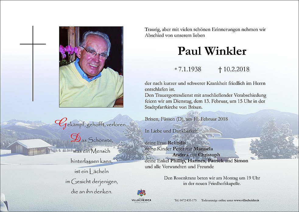 Den Trauergottesdienst mit anschließender Verabschiedung feiern wir am Dienstag, dem 13. Februar, um 15 Uhr in der Stadtpfarrkirche von Brixen.