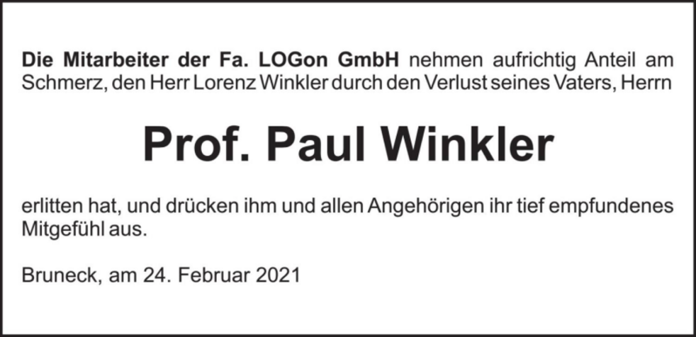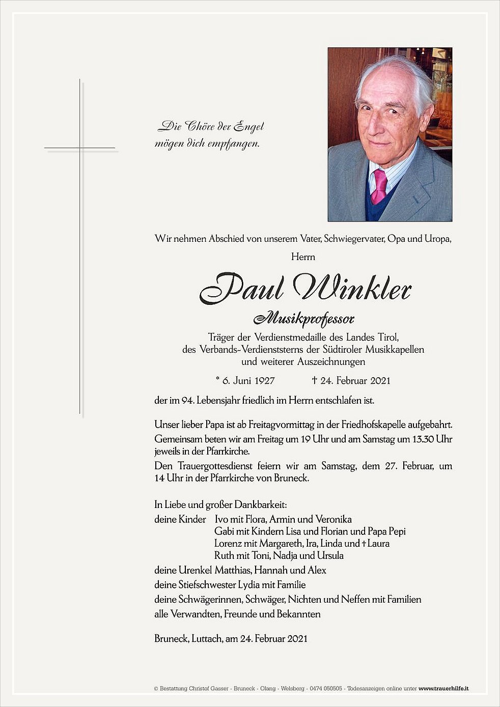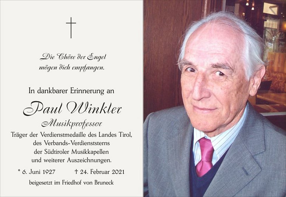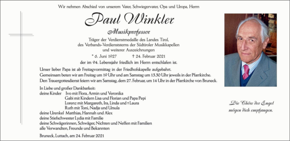 Den Trauergottesdienst feiern wir am Samstag, dem 27. Februar, um 14 Uhr in der Pfarrkirche von Bruneck.