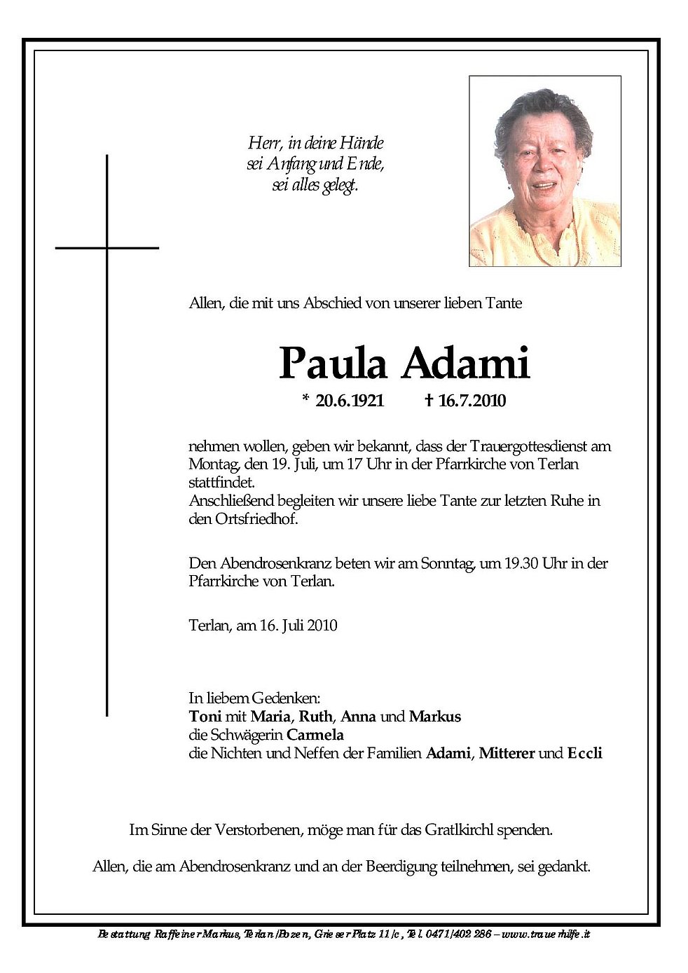 nehmen wollen, geben wir bekannt, dass der Trauergottesdienst am Montag, dem 19. Juli, um 17 Uhr in der Pfarrkirche von Terlan stattfindet. Anschließend begleiten wir unsere liebe Tante zur letzten Ruhe in den Ortsfriedhof.
