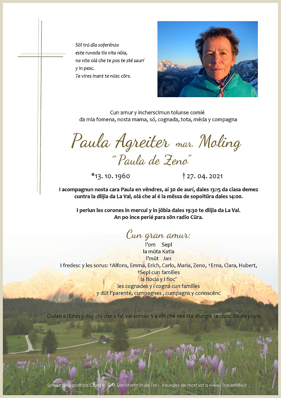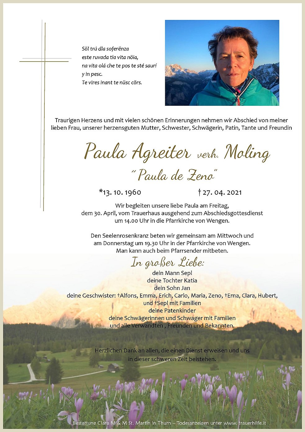 Wir begleiten unsere liebe Paula am Freitag, dem 30. April, um 13.15 Uhrt vom Trauerhaus ausgehend zum Abschiedsgottesdienst um 14.00 Uhr in die Pfarrkirche von Wengen.