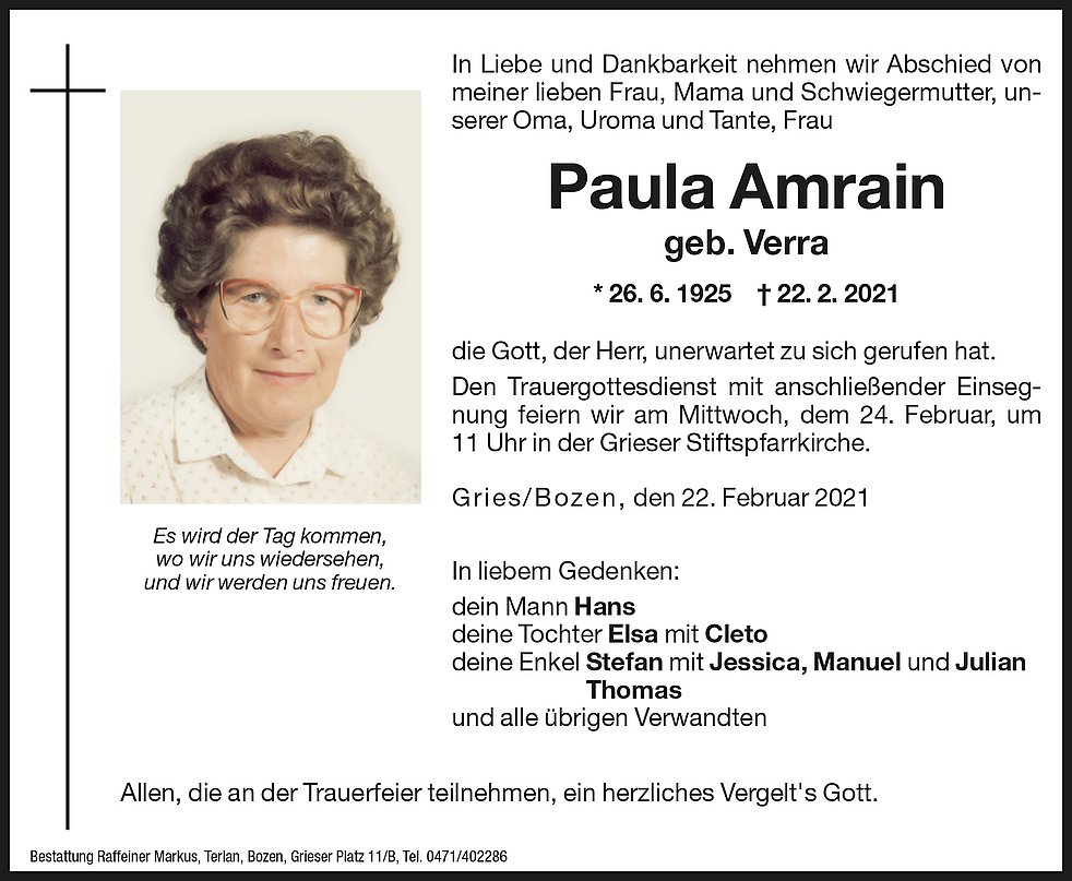 Den Trauergottesdienst mit anschließender Einsegnung feiern wir am Mittwoch, dem 24. Februar, um 11 Uhr in der Grieser Stiftspfarrkirche.