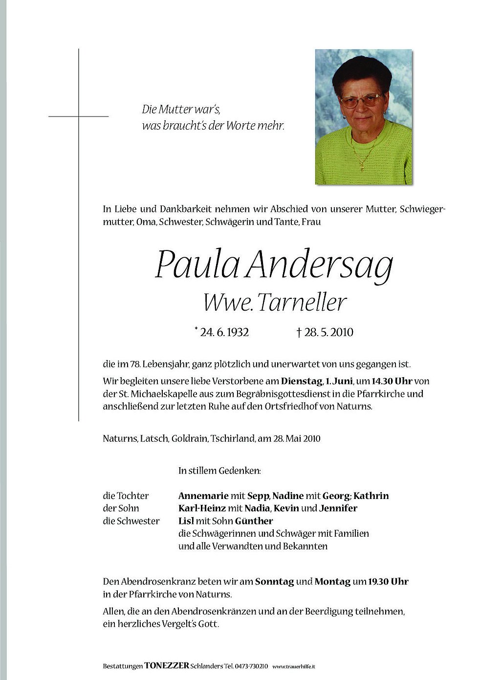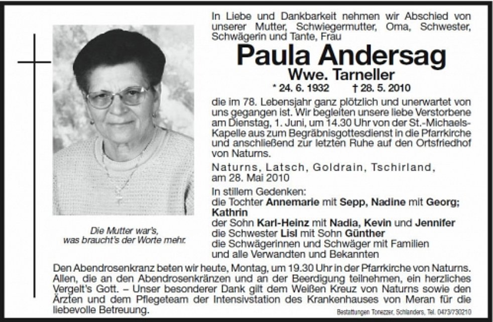 Wir begleiten unsere liebe Verstorbene am Dienstag, 1. Juni, um 14.30 Uhr von der St. Michaelskapelle aus zum Begräbnisgottesdienst in die Pfarrkirche und anschließend zur letzten Ruhe auf den Ortsfriedhof von Naturns.