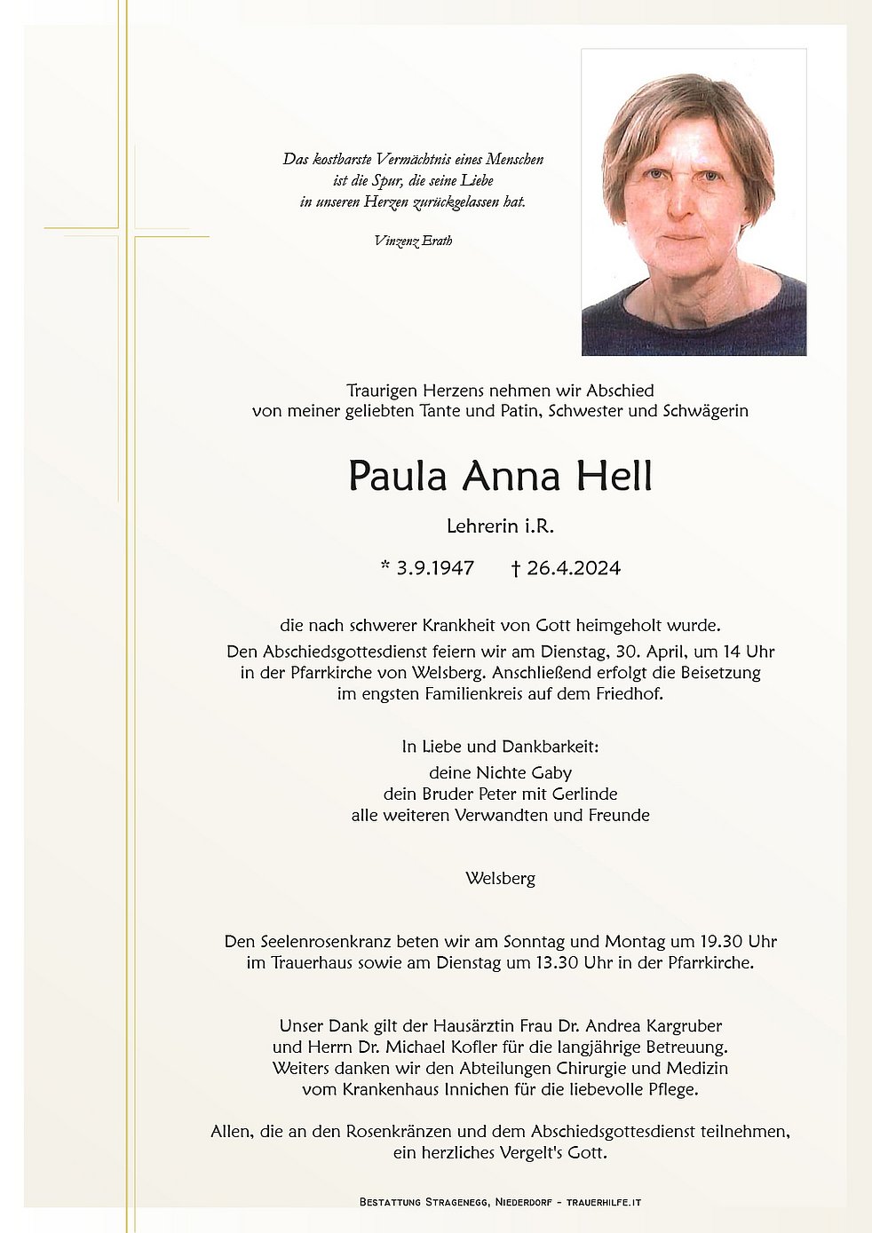 Begräbnisgottesdienst: 30.04. - 14:00 Uhr Welsberg