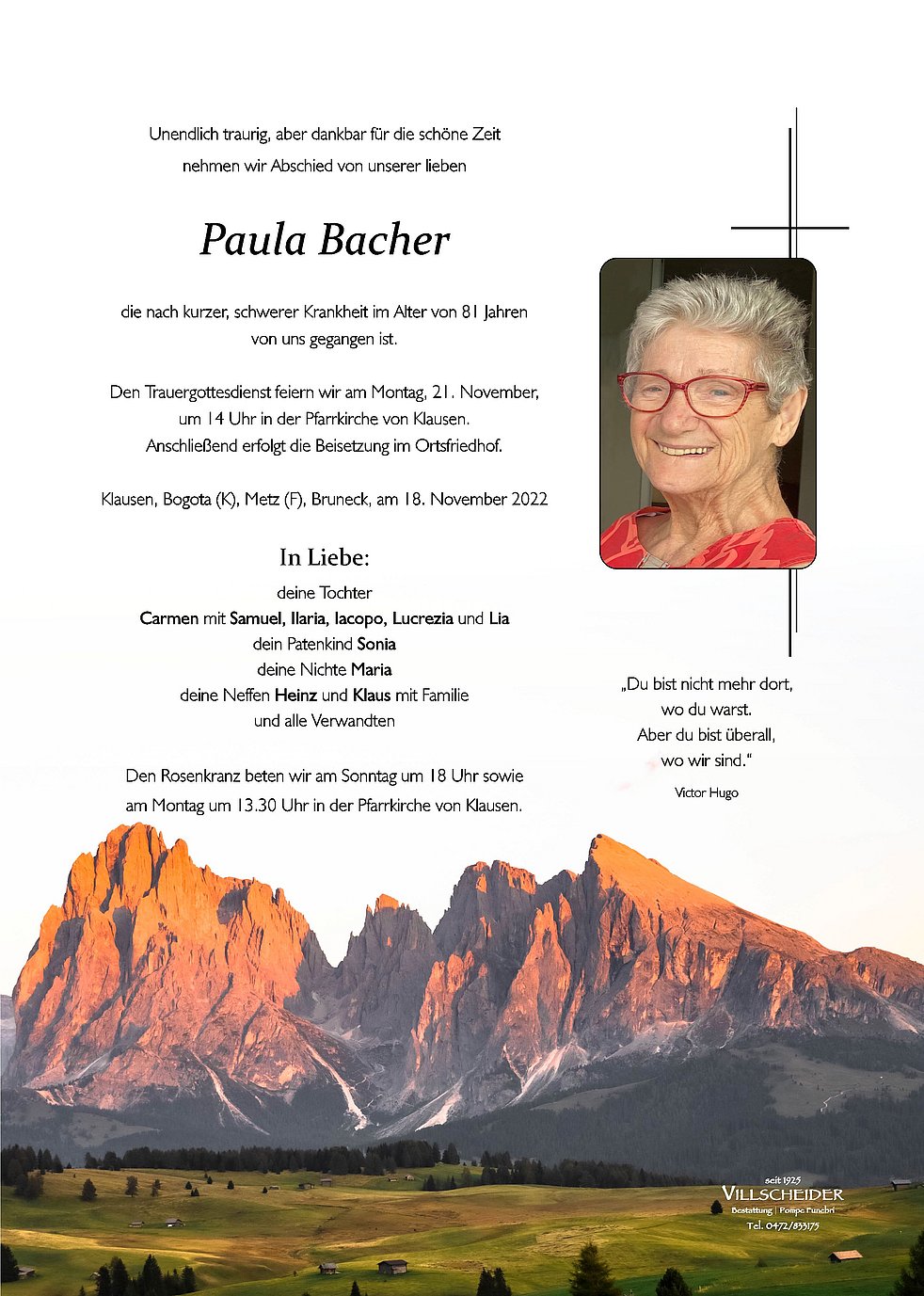 Begräbnisgottesdienst: 21.11. - 14:00 Uhr Klausen