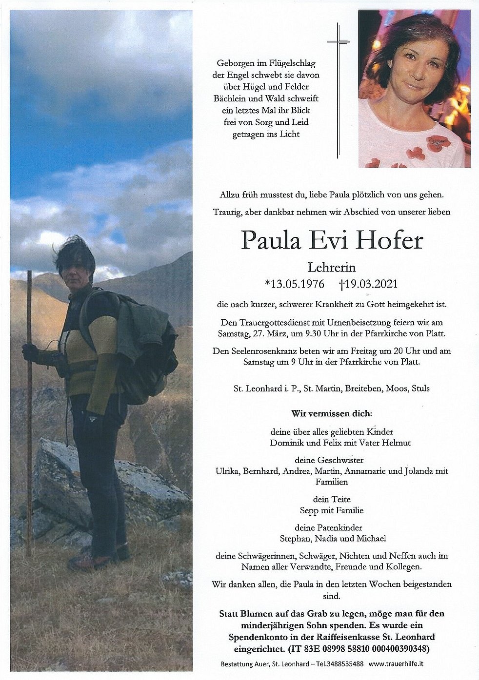 Statt Blumen auf das Grab zu legen, möge man für den minderjährigen Sohn spenden. Es wurde ein Spendenkonto in der Raiffeisenkasse St. Leonhard eingerichtet. (IT 83E 08998 58810 000400390348)