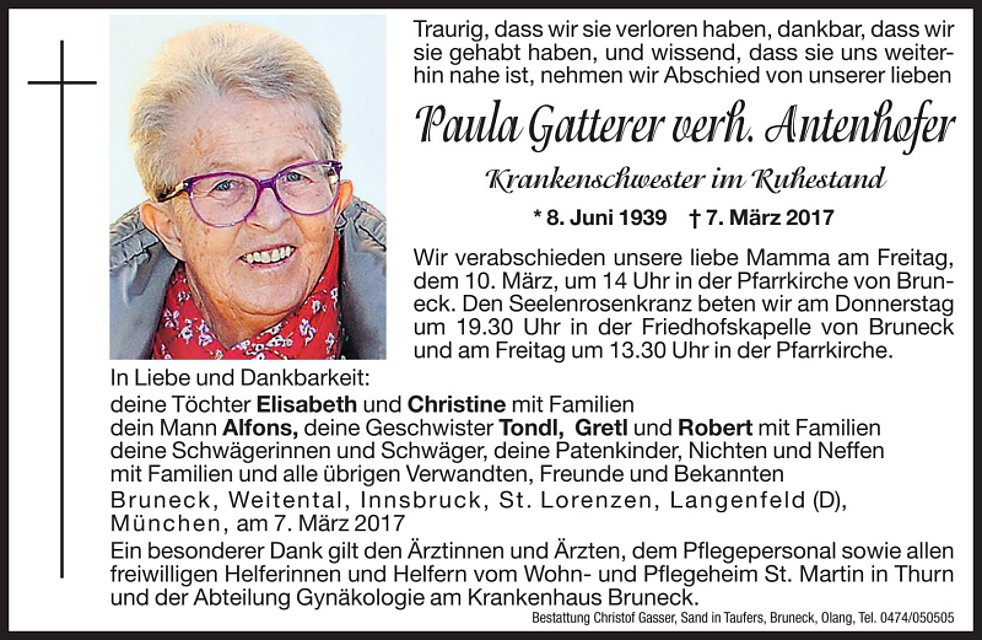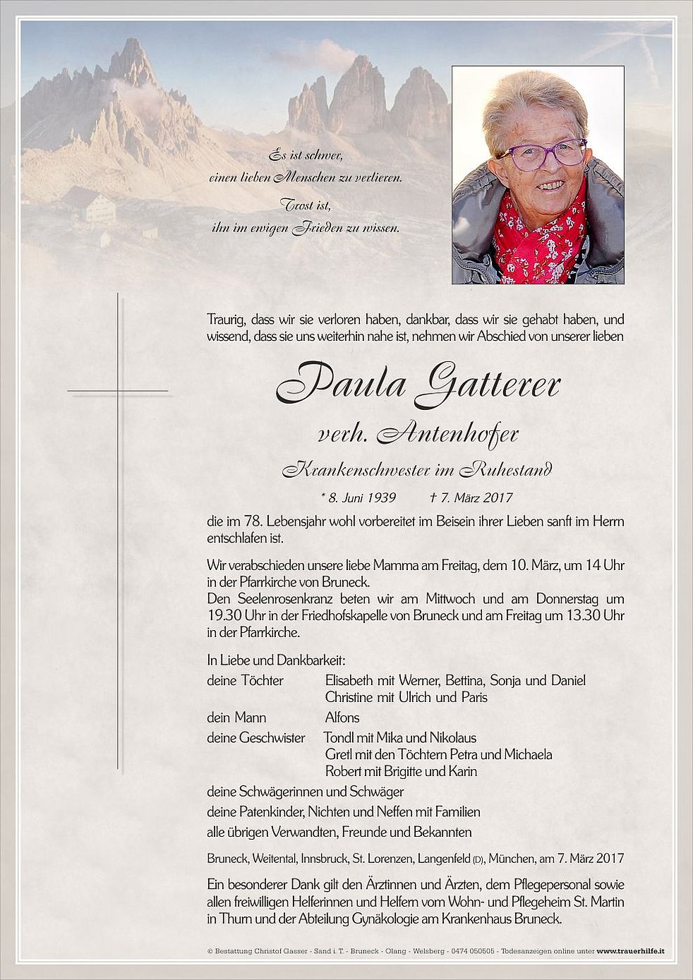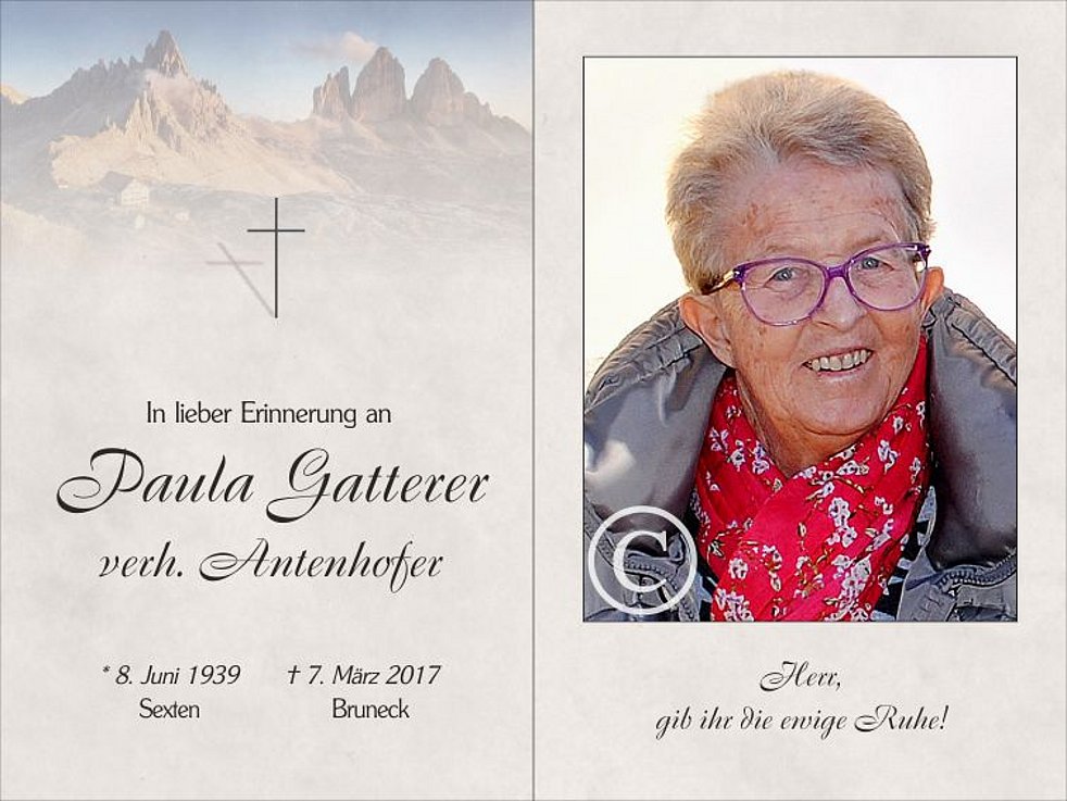 Wir verabschieden unsere liebe Mamma am Freitag, dem 10. März, um 14 Uhr in der Pfarrkirche von Bruneck.