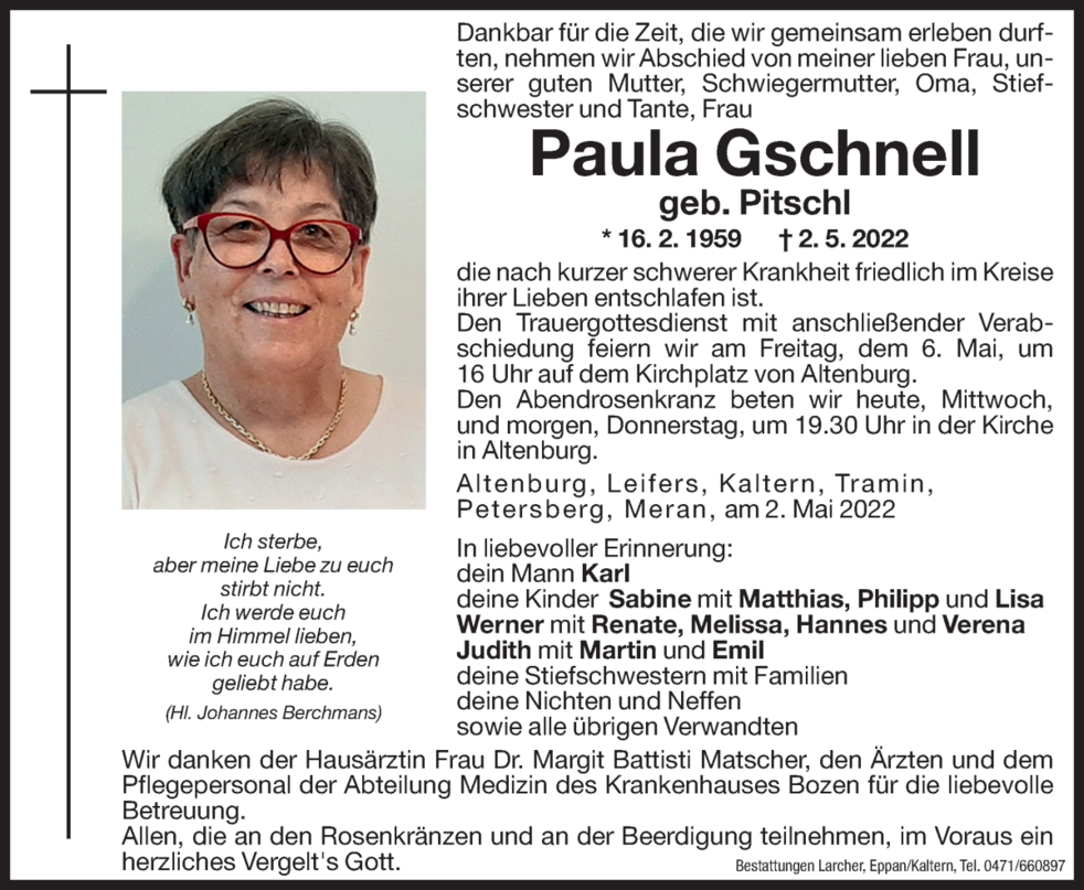 Wir danken der Hausärztin Frau Dr. Margit Battisti Matscher, den Ärzten und dem Pflegepersonal der Abteilung Medizin des Krankenhauses Bozen für die liebevolle Betreuung.
