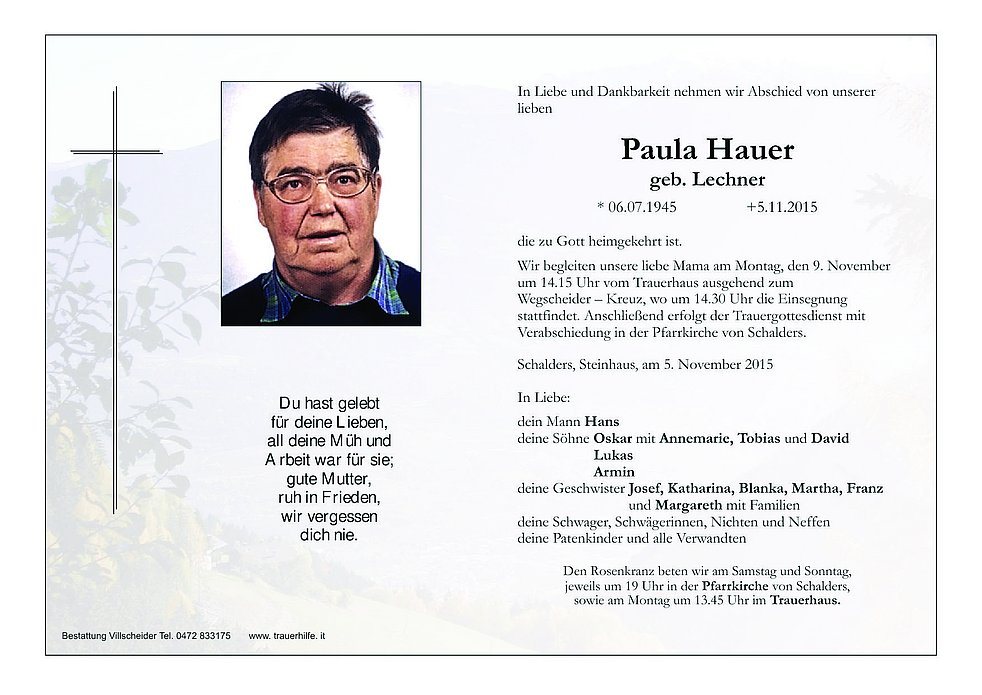 Wegscheider – Kreuz, wo um 14.30 Uhr die Einsegnung stattfindet. Anschließend erfolgt der Trauergottesdienst mit Verabschiedung in der Pfarrkirche von Schalders.