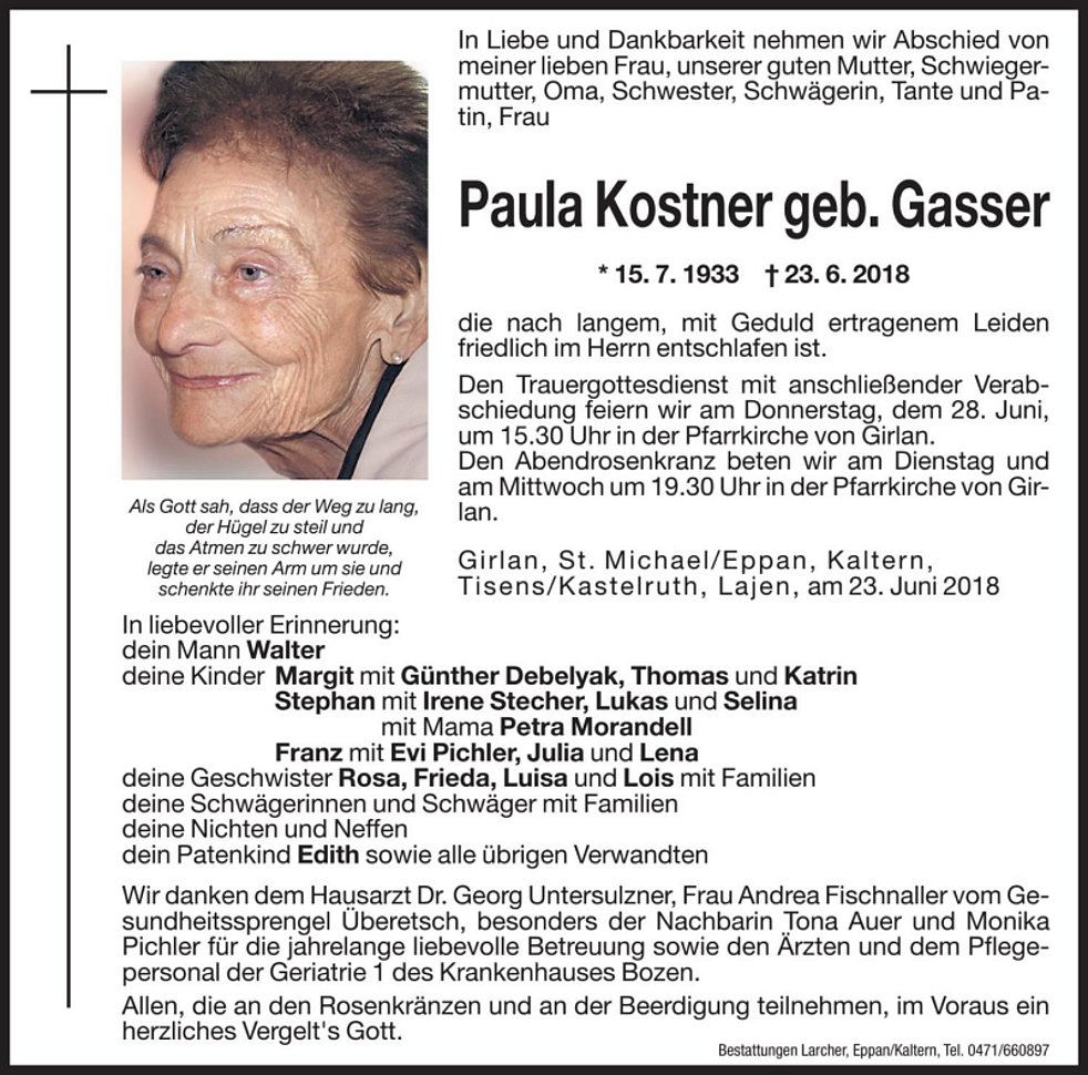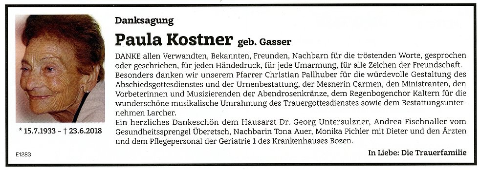 Wir danken dem Hausarzt Dr. Georg Untersulzner, Frau Andrea Fischnaller vom Gesundheitssprengel Überetsch, besonders der Nachbarin Tona Auer und Monika Pichler für die jahrelange, liebevolle Betreuung sowie den Ärzten und dem Pflegepersonal der Geriatrie 1 des Krankenhauses Bozen.