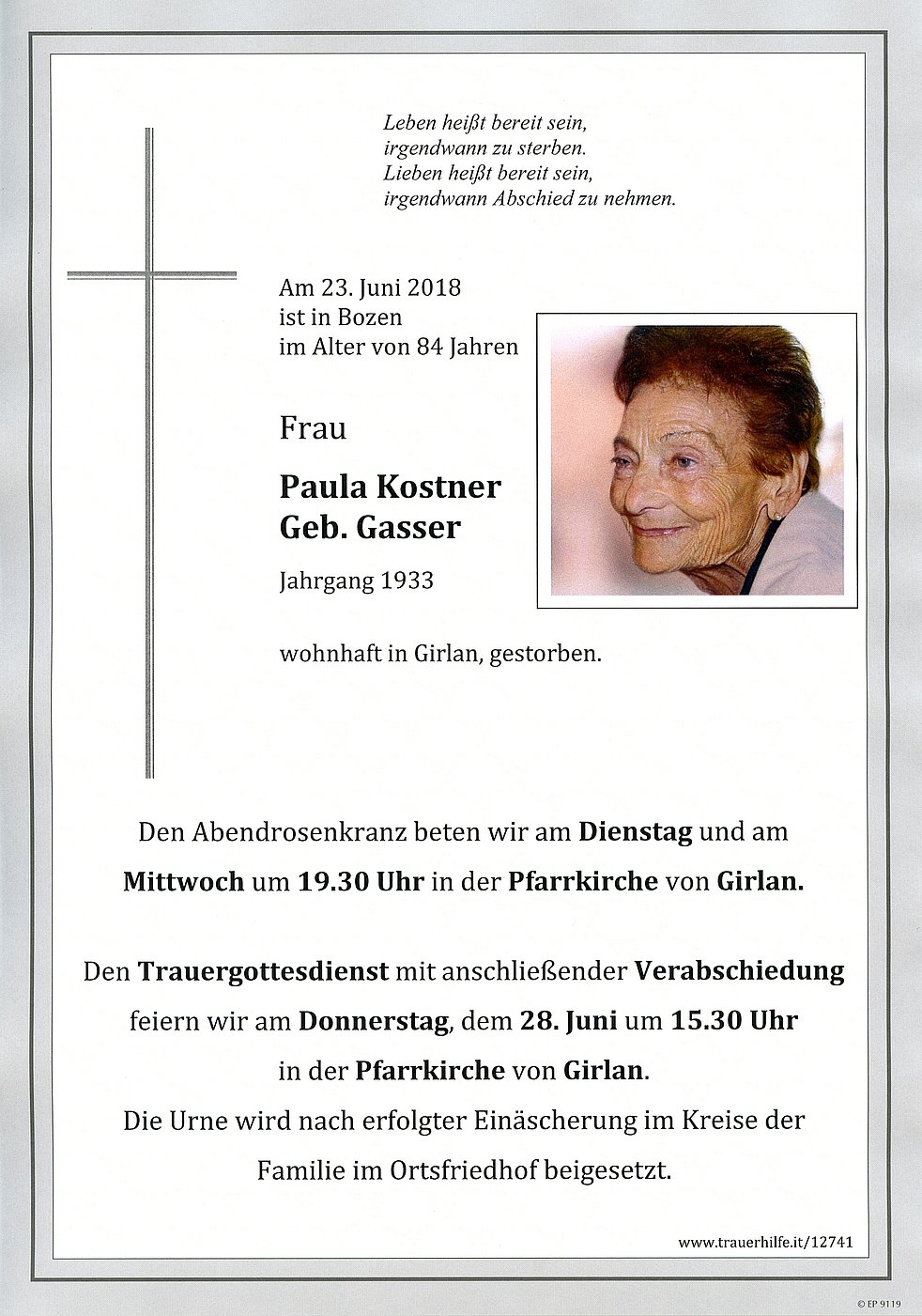 Den Trauergottesdienst mit anschließender Verabschiedung feiern wir am Donnerstag, dem 28. Juni um 15.30 Uhr in der Pfarrkirche von Girlan.