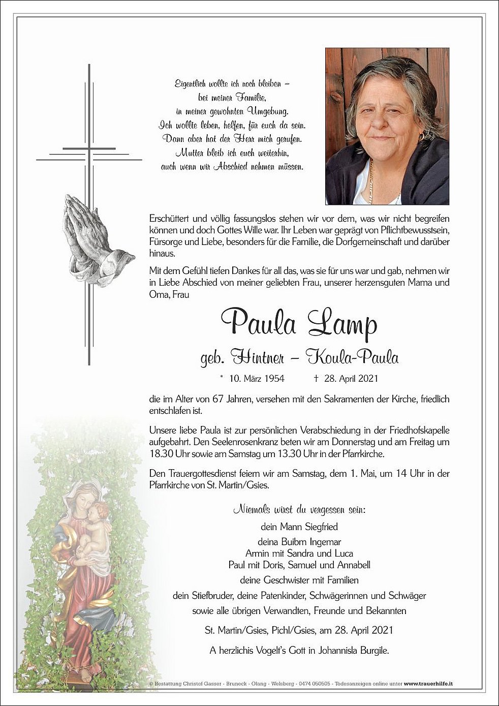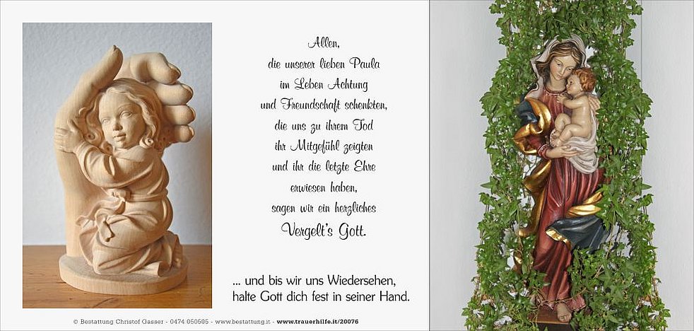 Unsere liebe Paula ist zur persönlichen Verabschiedung in der Friedhofskapelle aufgebahrt. Den Seelenrosenkranz beten wir am Donnerstag und am Freitag um 18.30 Uhr sowie am Samstag um 13.30 Uhr in der Pfarrkirche.