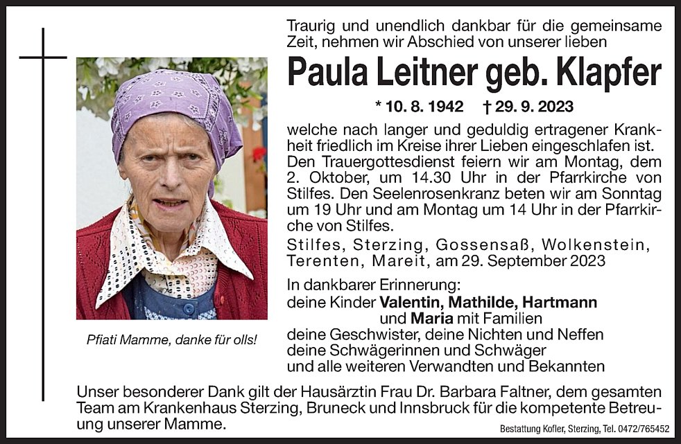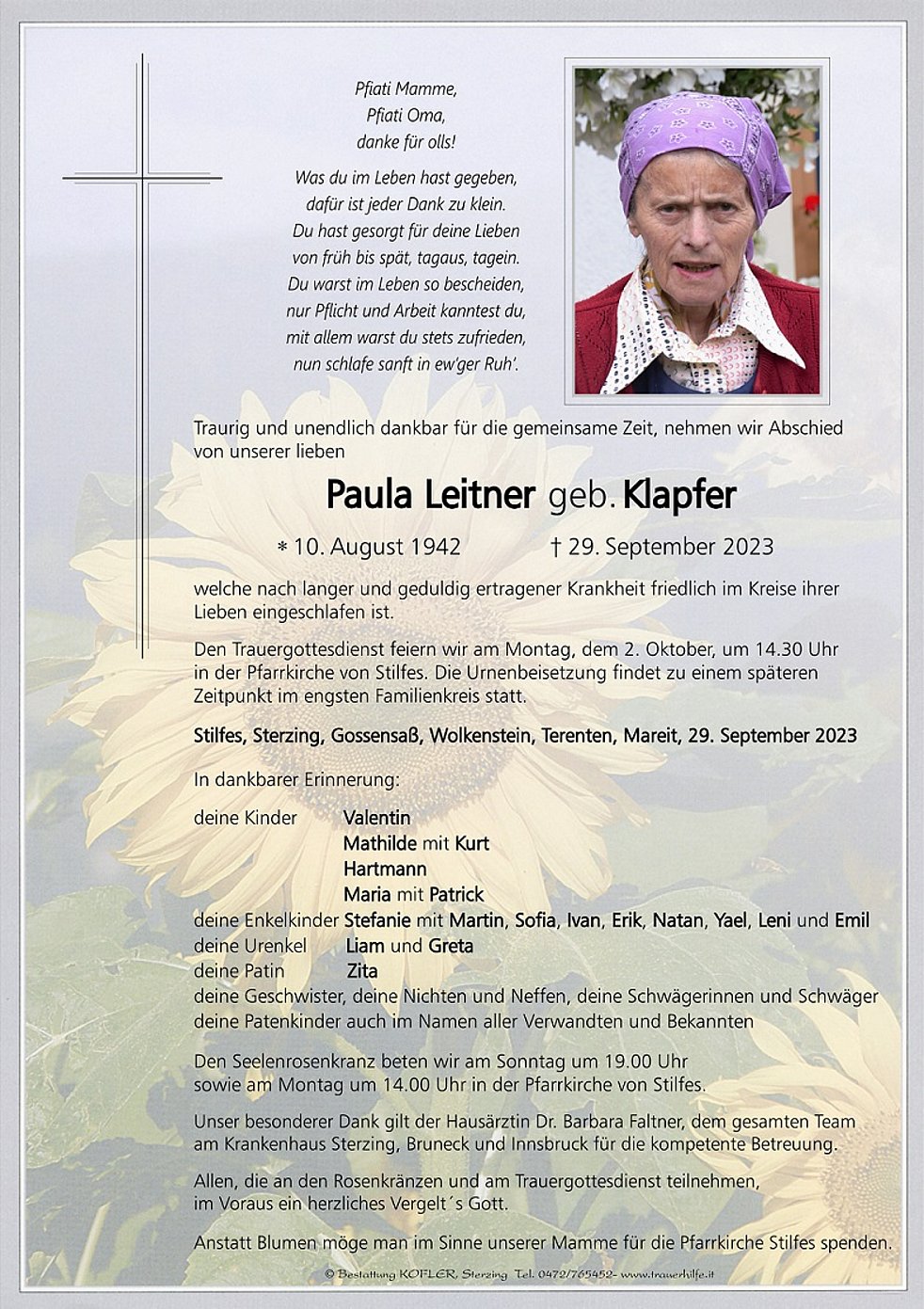 Den Trauergottesdienst feiern wir am Montag, dem 2. Oktober, um 14.30 Uhr in der Pfarrkirche von Stilfes. Die Urnenbeisetzung findet zu einem späteren Zeitpunkt im engsten Familienkreis statt.