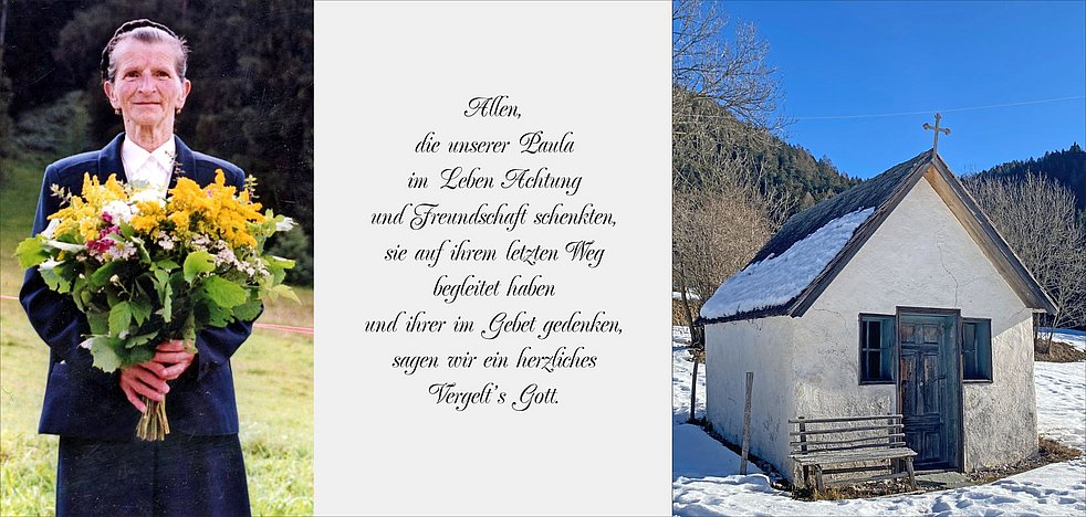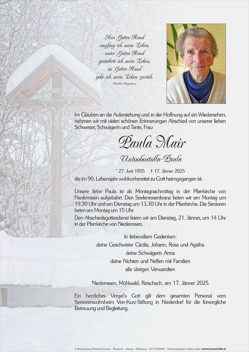 Unsere liebe Paula ist ab Montagnachmittag in der Pfarrkirche von Niederrasen aufgebahrt. Den Seelenrosenkranz beten wir am Montag um 19.30 Uhr und am Dienstag um 13.30 Uhr in der Pfarrkirche. Die Senioren beten am Montag um 15 Uhr.