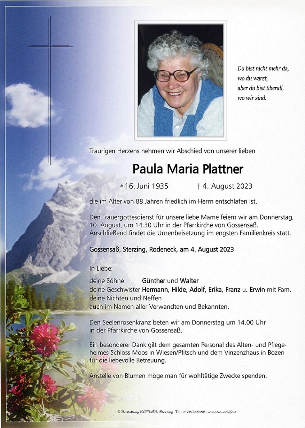 Den Trauergottesdienst für unsere liebe Mame feiern wir am Donnerstag, 10. August, um 14.30 Uhr in der Pfarrkirche von Gossensaß. Anschließend findet die Urnenbeisetzung im engsten Familienkreis statt.