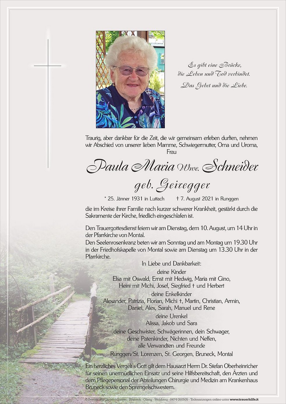 * 25. Jänner 1931 in Luttach † 7. August 2021 in Runggen