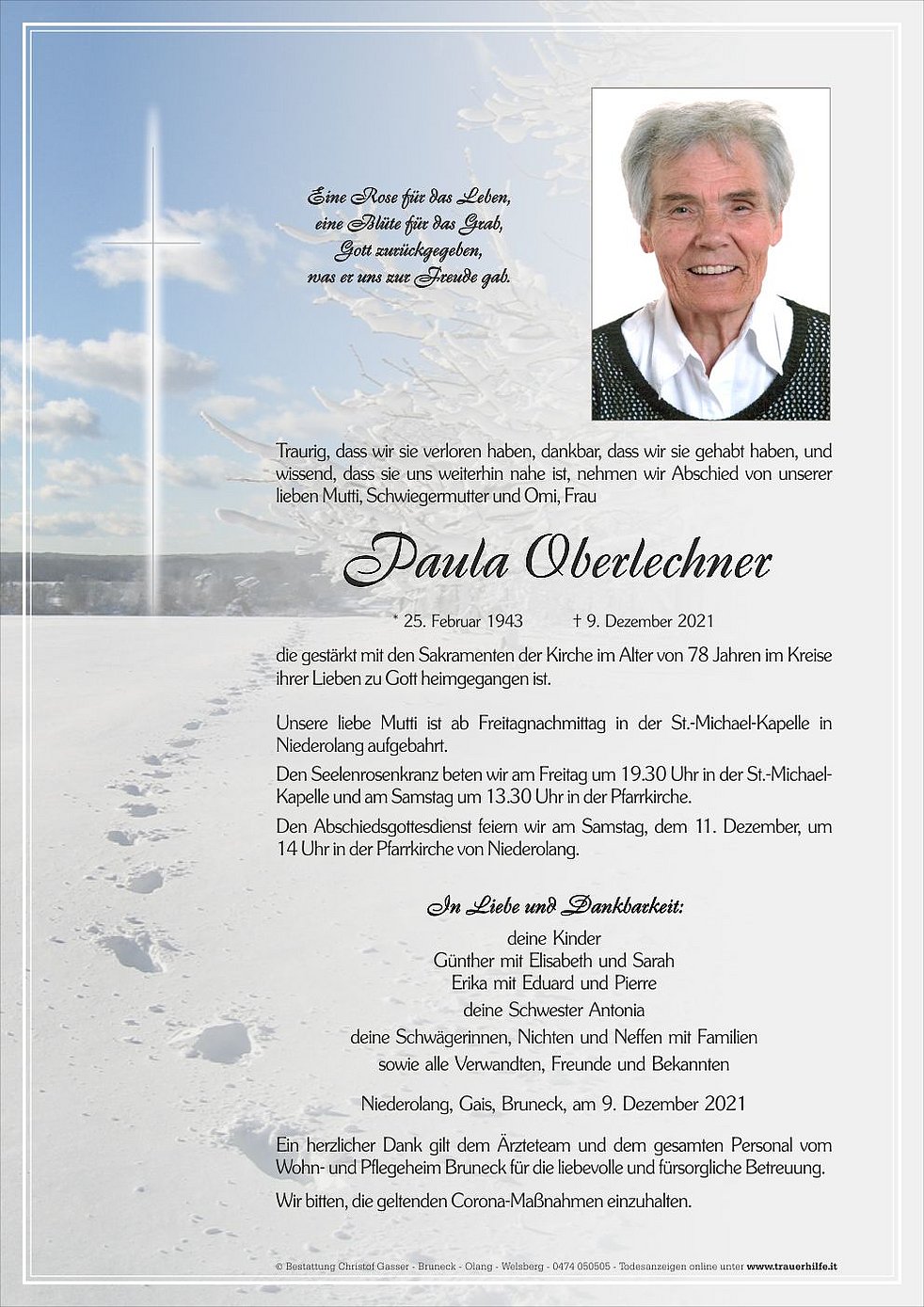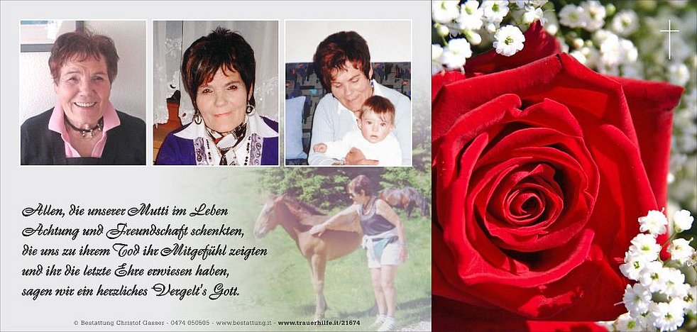 Ein herzlicher Dank gilt dem Ärzteteam und dem gesamten Personal vom Wohn- und Pflegeheim Bruneck für die liebevolle und fürsorgliche Betreuung.