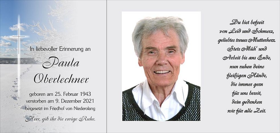 Unsere liebe Mutti ist ab Freitagnachmittag in der St.-Michael-Kapelle in Niederolang aufgebahrt.
