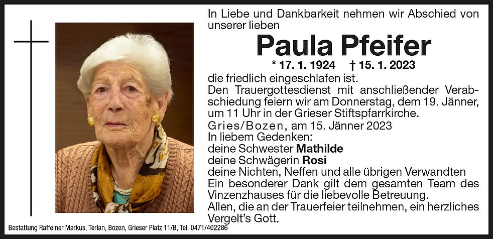 Den Trauergottesdienst mit anschließender Verabschiedung feiern wir am Donnerstag, dem 19. Jänner, um 11 Uhr in der Grieser Stiftspfarrkirche.