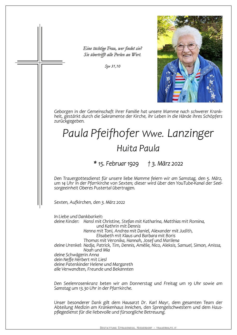 Den Trauergottesdienst für unsere liebe Mamme feiern wir am Samstag, den 5. März, um 14 Uhr in der Pfarrkirche von Sexten; dieser wird über den YouTube-Kanal der Seelsorgeeinheit Oberes Pustertal übertragen.