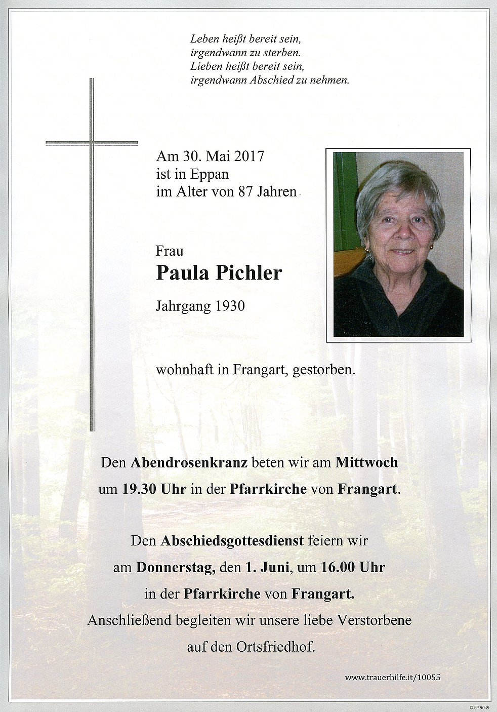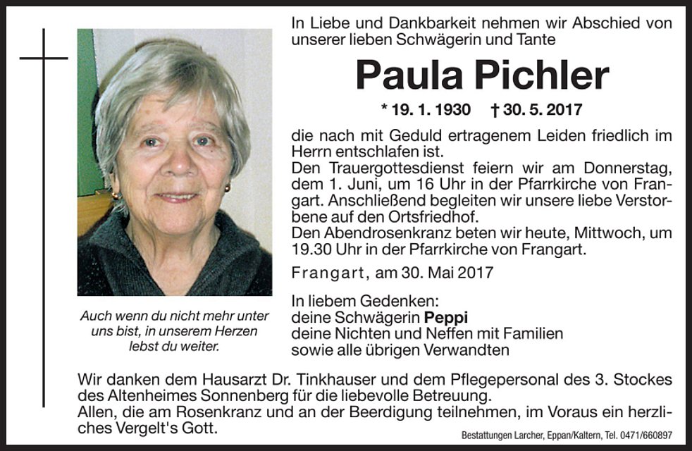 Den Trauergottesdienst feiern wir am Donnerstag, dem 1. Juni um 16 Uhr in der Pfarrkirche von Frangart. Anschließend begleiten wir unsere liebe Verstorbene auf den Ortsfriedhof.