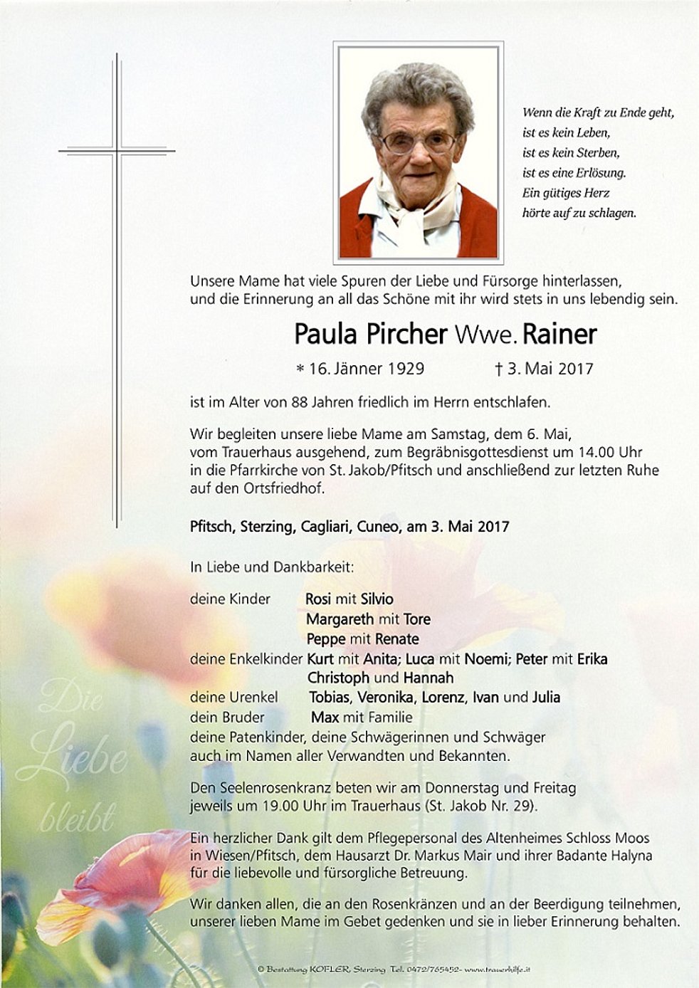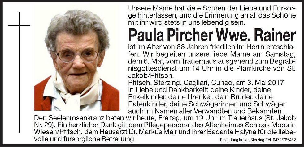 Wir begleiten unsere liebe Mame am Samstag, dem 6. Mai, vom Trauerhaus ausgehend, zum Begräbnisgottesdienst um 14.00 Uhr in die Pfarrkirche von St. Jakob/Pfitsch und anschließend zur letzten Ruhe auf den Ortsfriedhof.