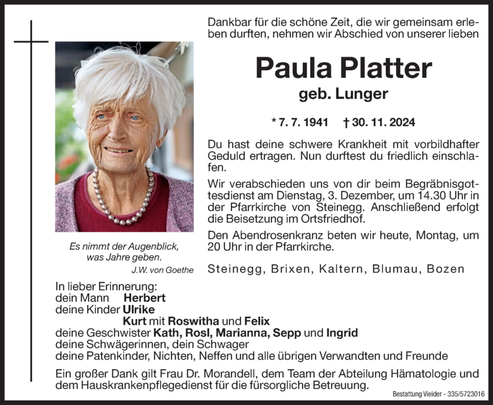 Wir verabschieden uns von dir beim Begräbnisgottesdienst am Dienstag, 3. Dezember, um 14.30 Uhr in der Pfarrkirche von Steinegg.