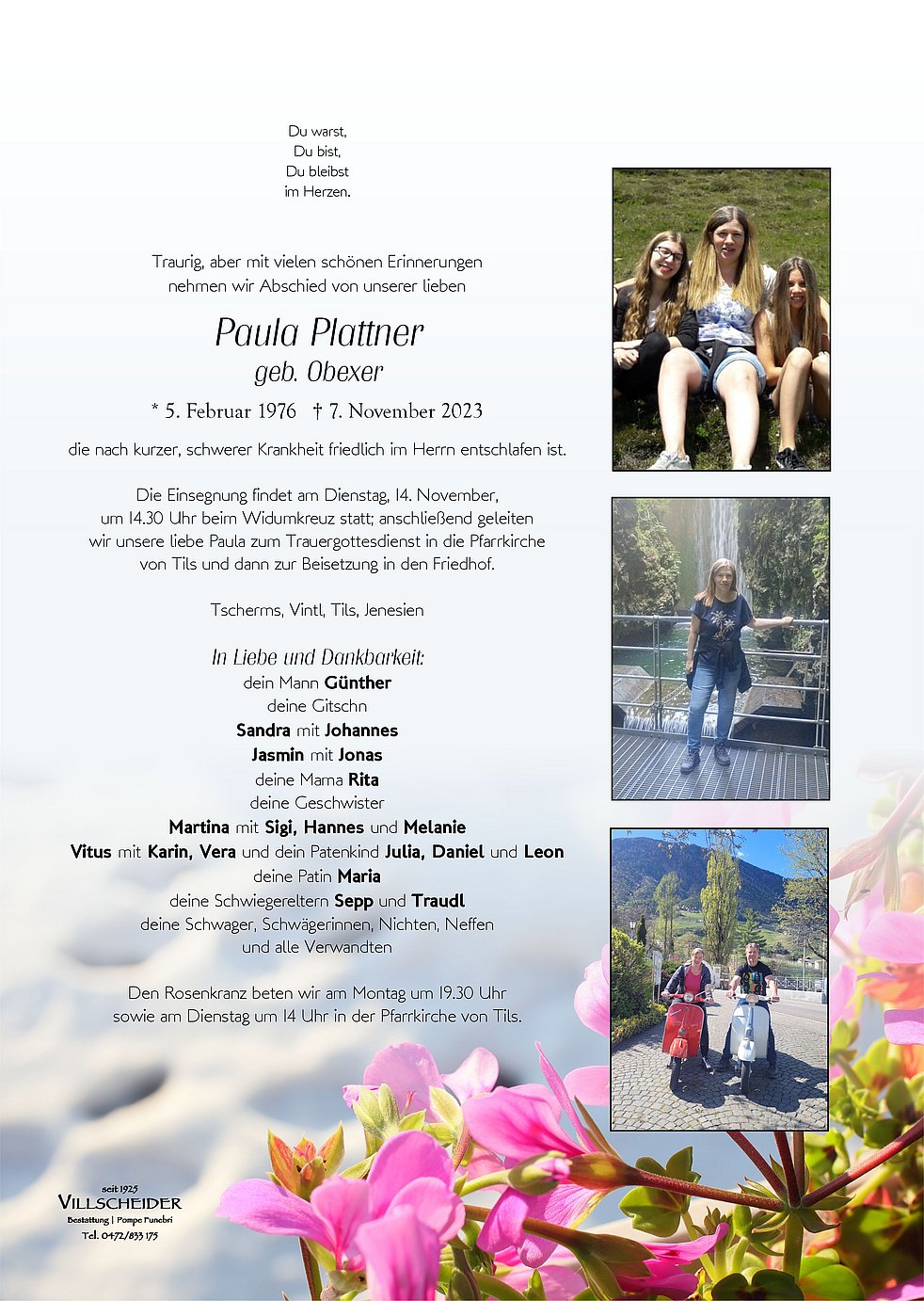 Tieferschüttert habe ich vom Tod eurer lieben Paula erfahren. Ich durfte für eine Woche ihre Bettnachbarin im Krankenhaus Meran sein, bis Covid uns trennte. Habe Paula bewundert, wie sie ihr Schicksal tapfer ertragen hat.