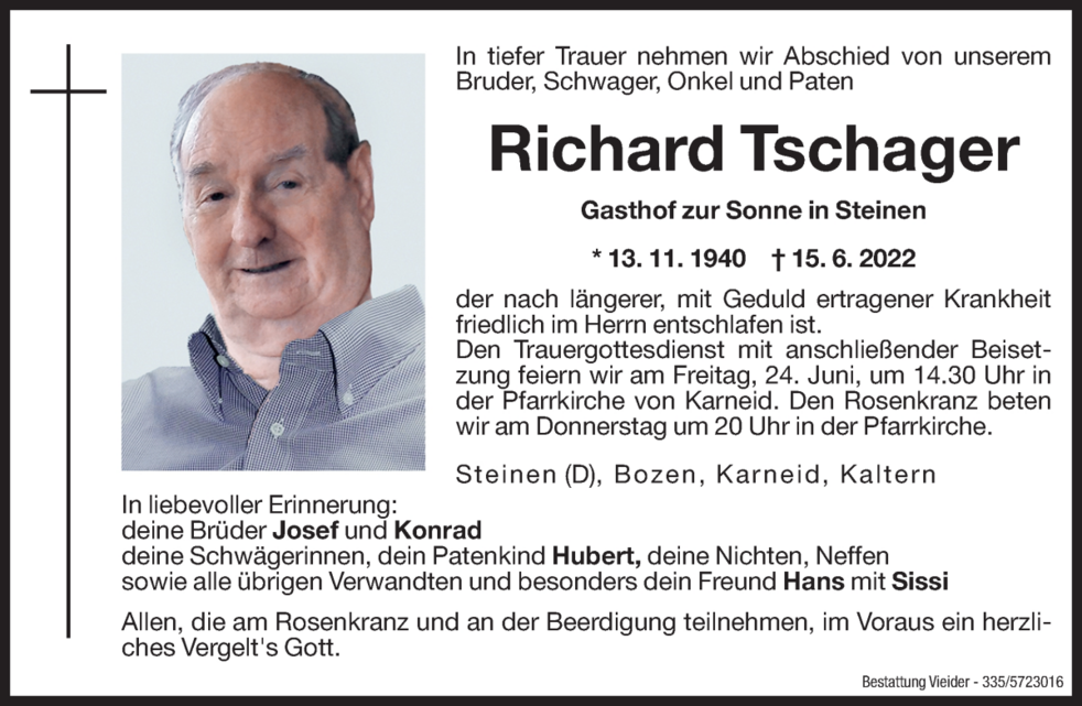 Den Abschiedsgottesdienst mit anschließender Beisetzung feiern wir am Samstag, 25 Juni, um 9.30 Uhr in der Pfarrkirche von Steinegg.