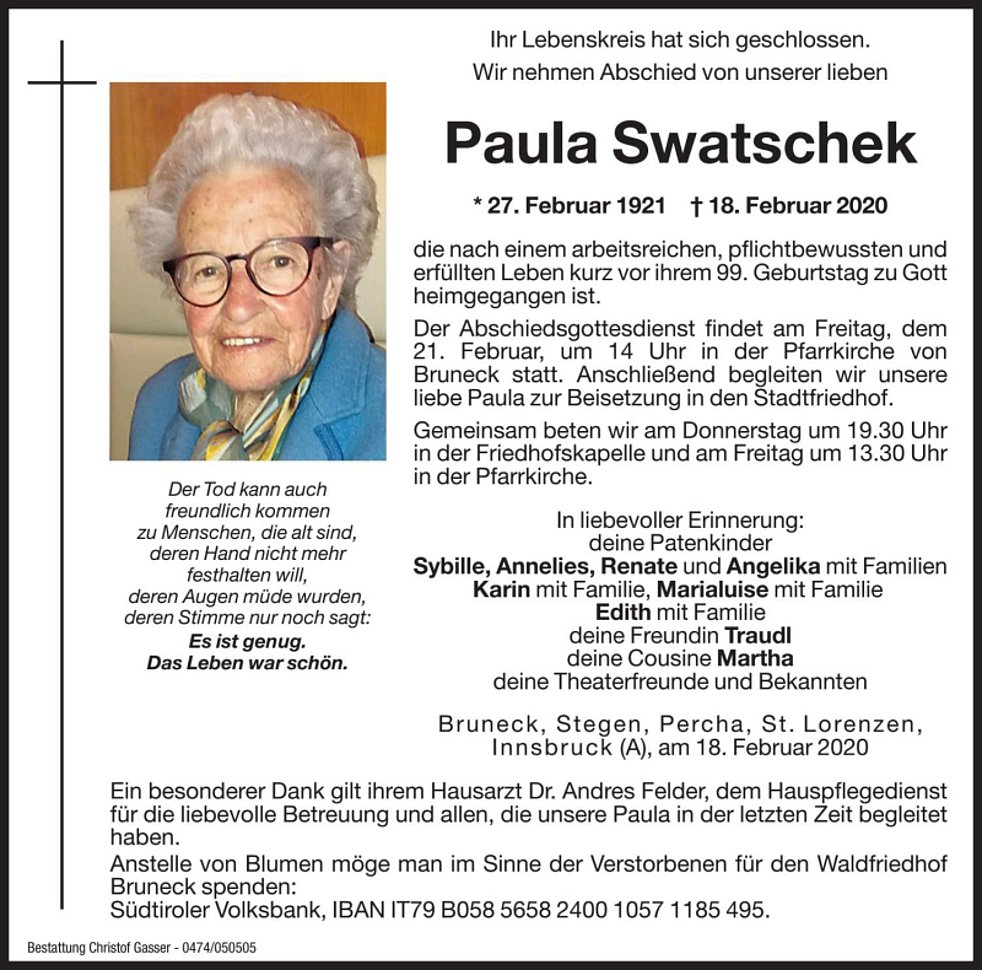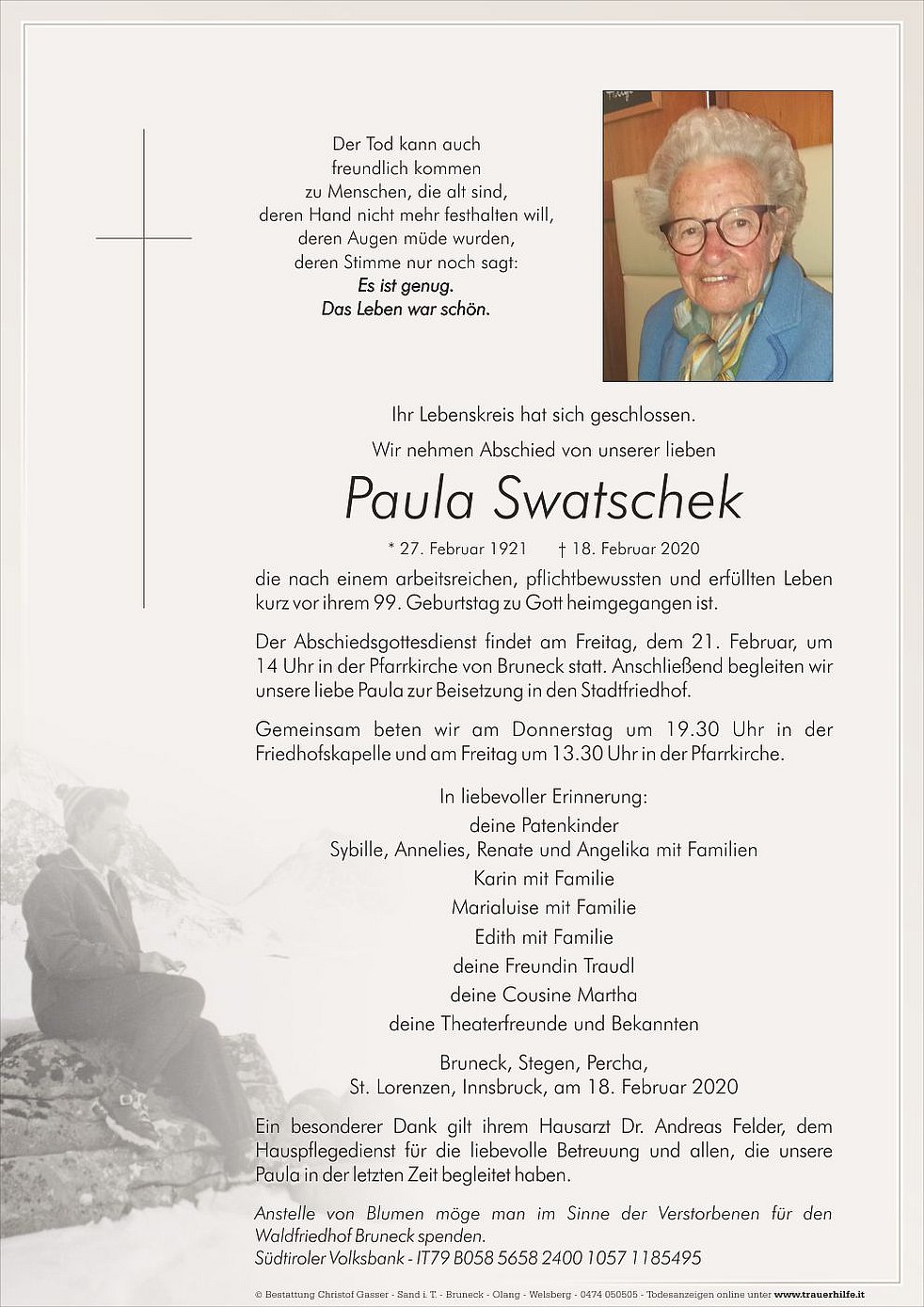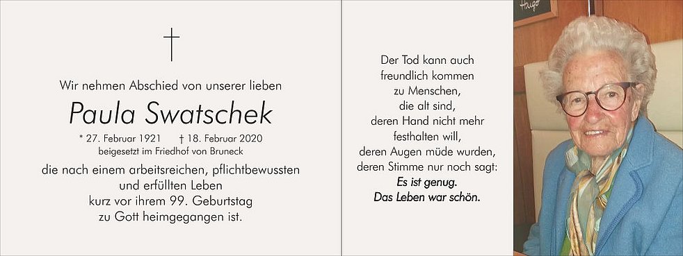 Der Abschiedsgottesdienst findet am Freitag, dem 21. Februar, um 14 Uhr in der Pfarrkirche von Bruneck statt. Anschließend begleiten wir unsere liebe Paula zur Beisetzung in den Stadtfriedhof.