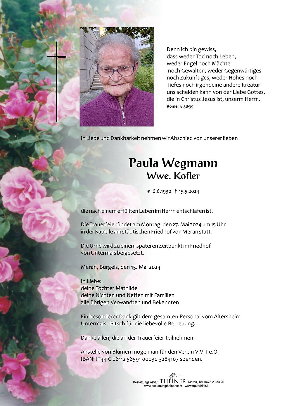 Die Trauerfeier findet am Montag, den 27. Mai 2024 um 15 Uhr in der Kapelle am städtischen Friedhof von Meran statt.