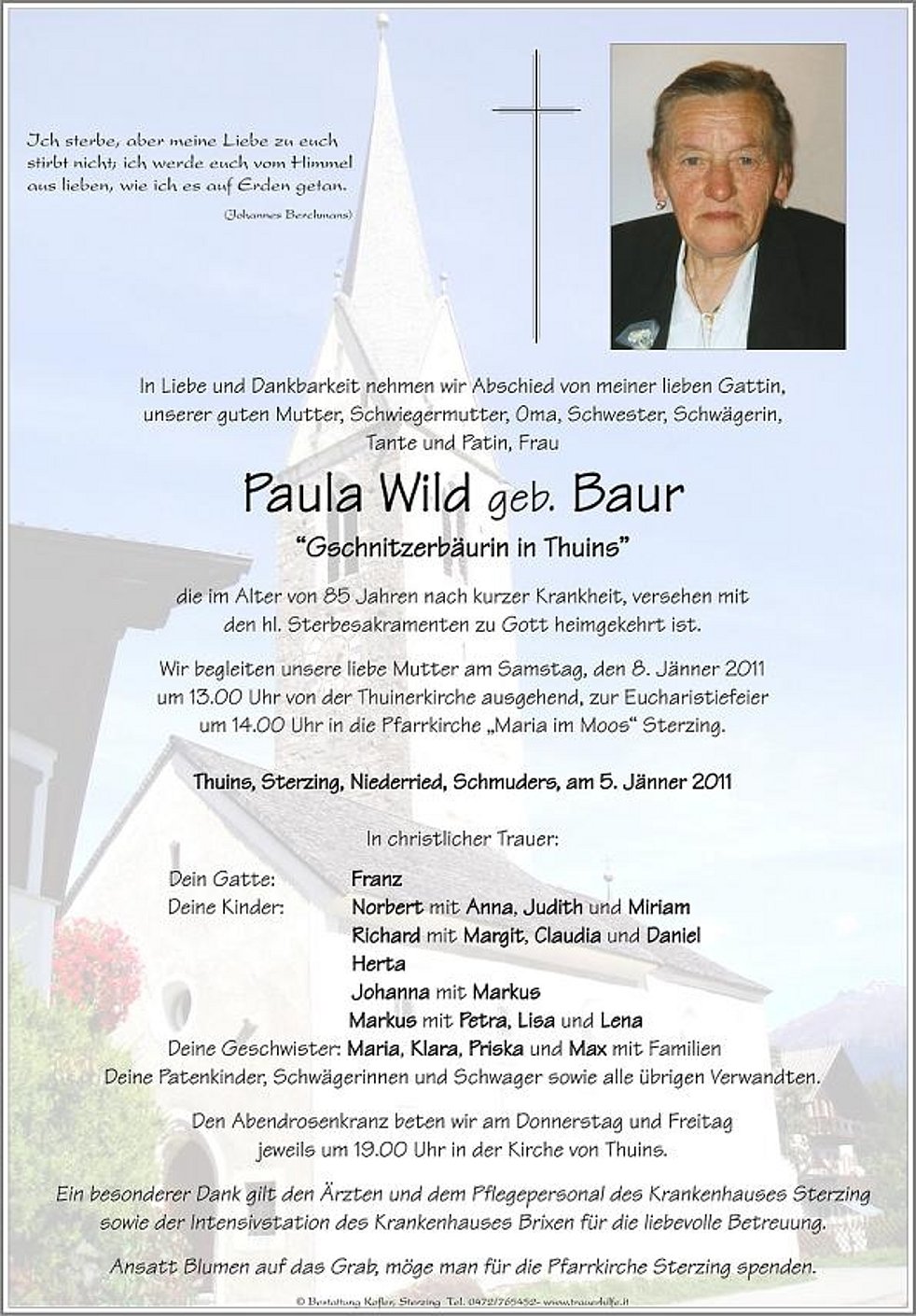 Ansatt Blumen auf das Grab, möge man für die Pfarrkirche Sterzing spenden.