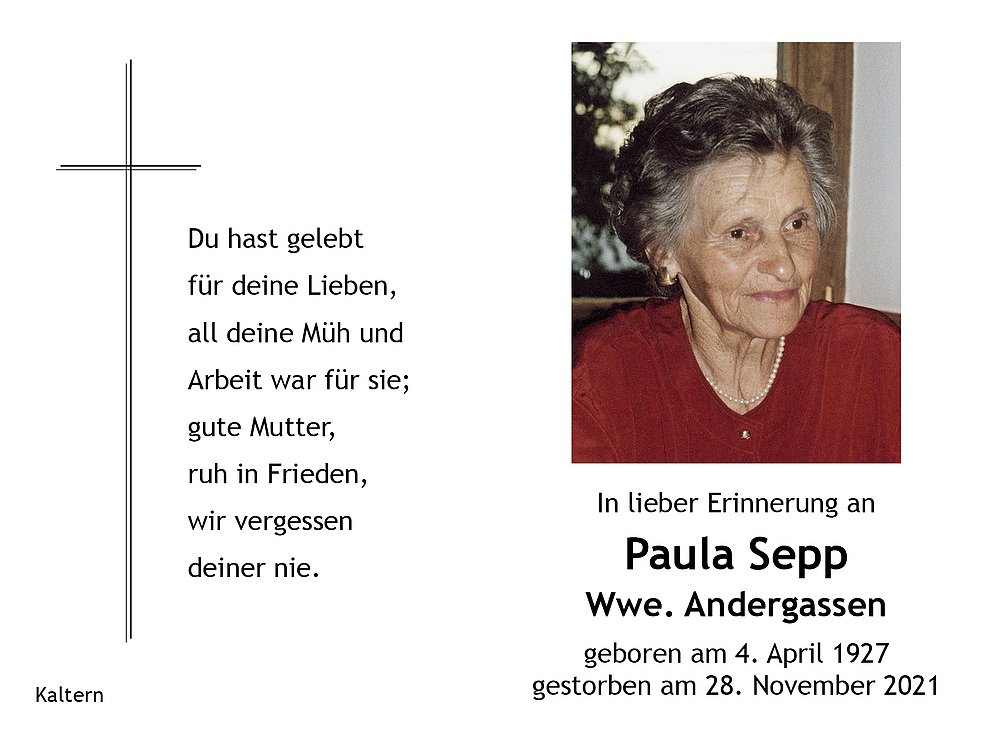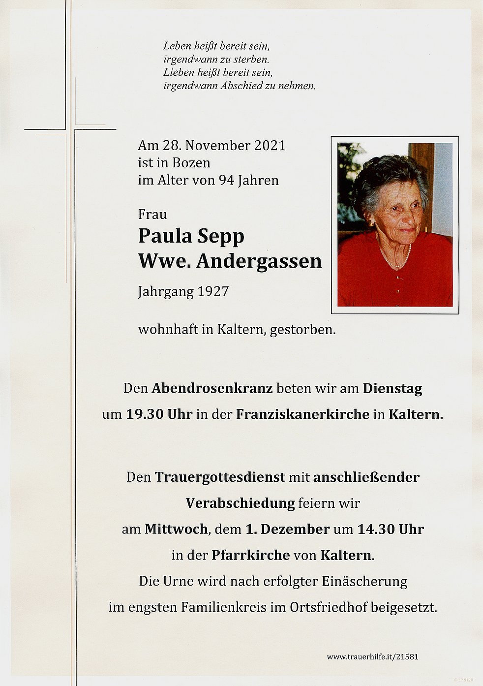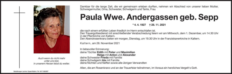 Den Trauergottesdienst mit anschließender Verabschiedung feiern wir am Mittwoch, dem 1. Dezember um 14.30 Uhr in der Pfarrkirche von Kaltern.
