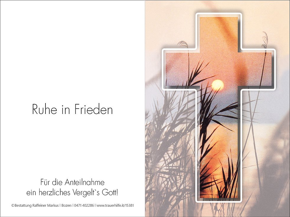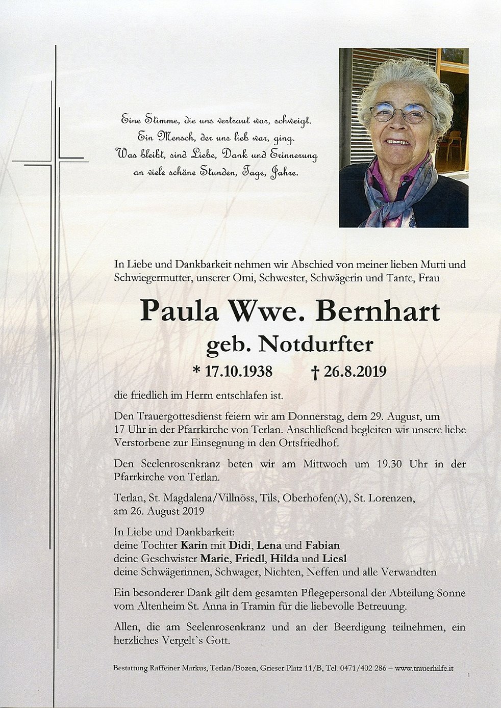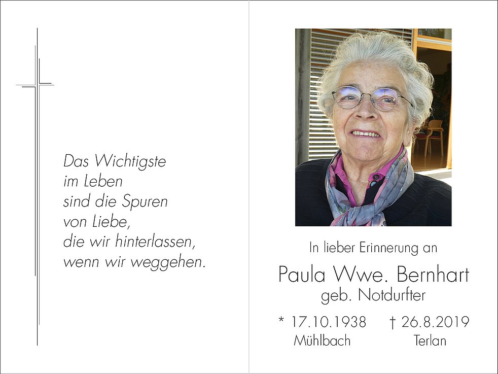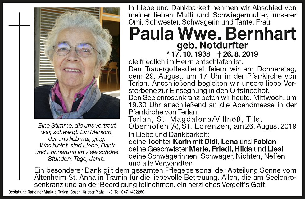 Den Trauergottesdienst feiern wir am Donnerstag, dem 29. August, um 17 Uhr in der Pfarrkirche von Terlan. Anschließend begleiten wir unsere liebe Verstorbene zur Einsegnung in den Ortsfriedhof.