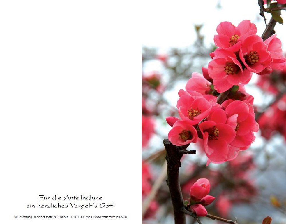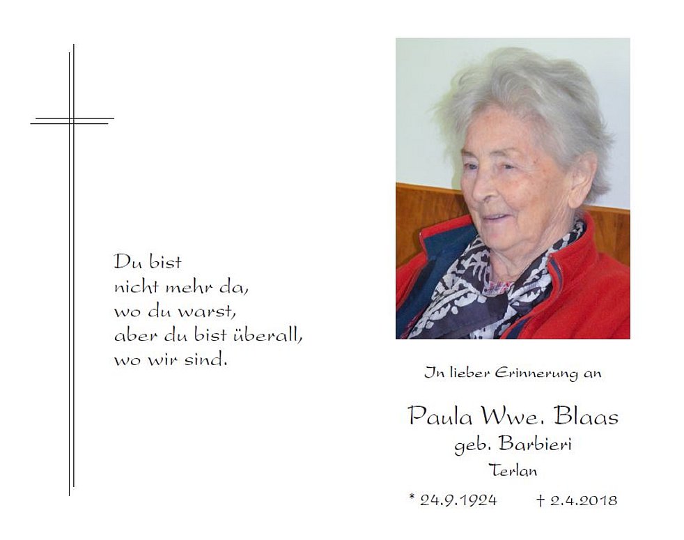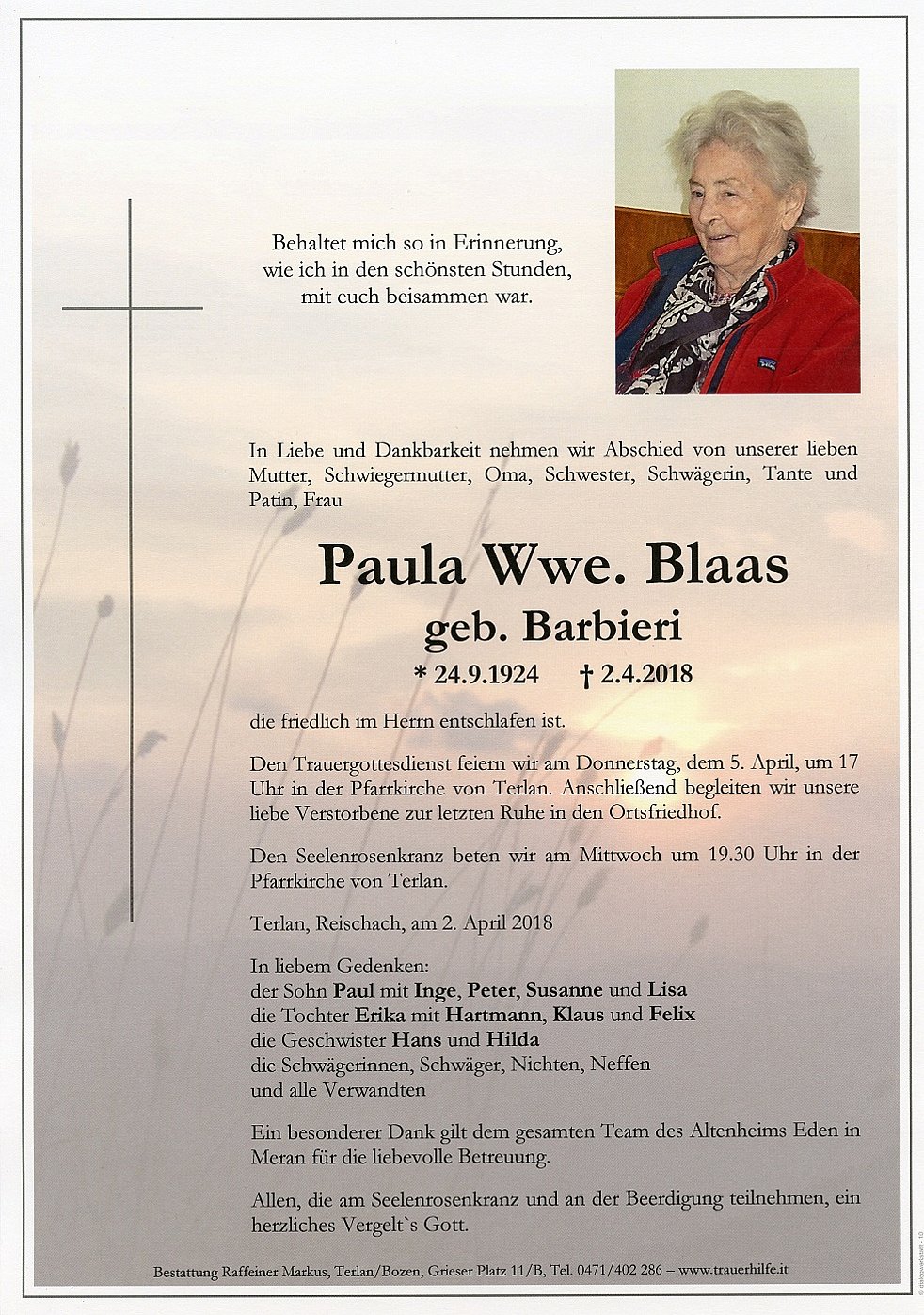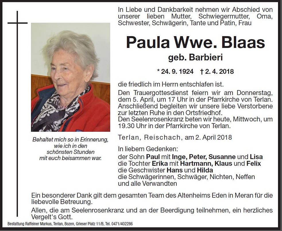 Den Trauergottesdienst feiern wir am Donnerstag, dem 5. April, um 17 Uhr in der Pfarrkirche von Terlan. Anschließend begleiten wir unsere liebe Verstorbene zur letzten Ruhe in den Ortsfriedhof.