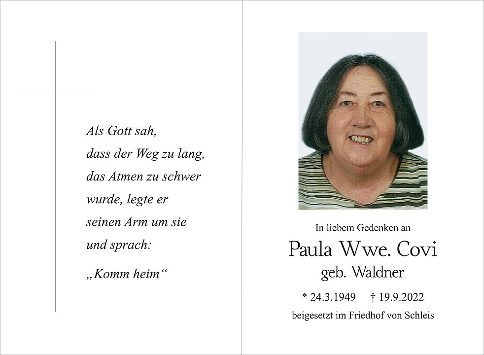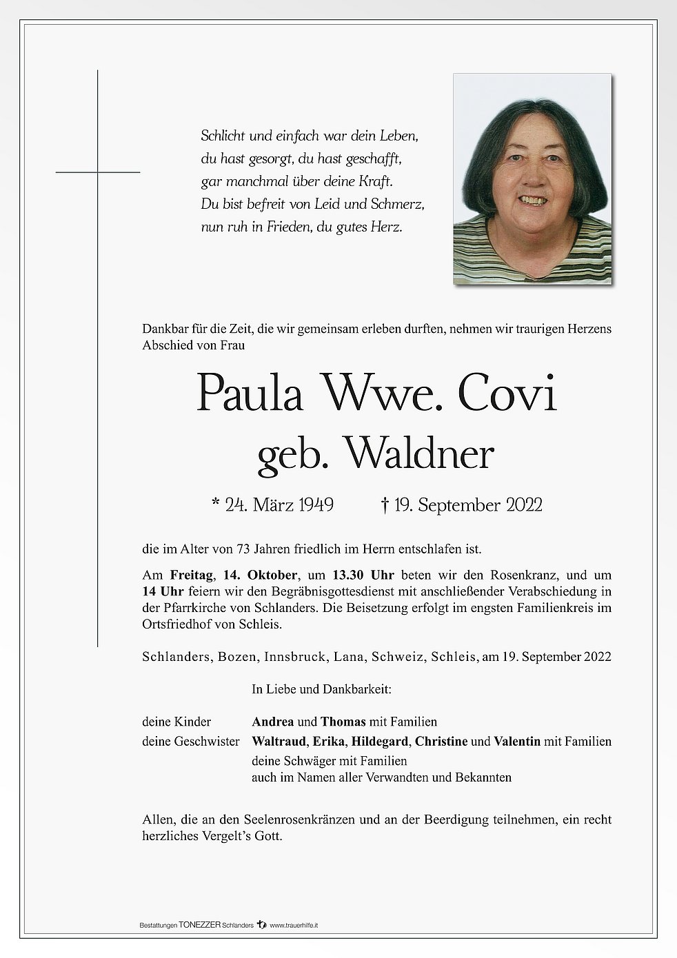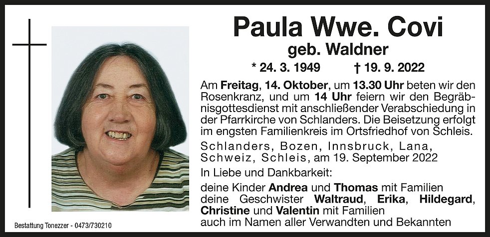 Am Freitag, 14. Oktober, um 13.30 Uhr beten wir den Rosenkranz, und um 14 Uhr feiern wir den Begräbnisgottesdienst mit anschließender Verabschiedung in der Pfarrkirche von Schlanders.