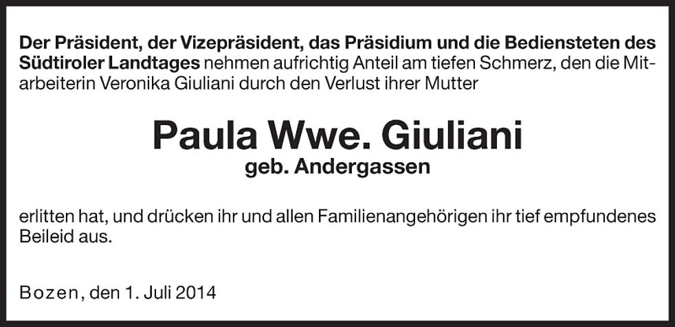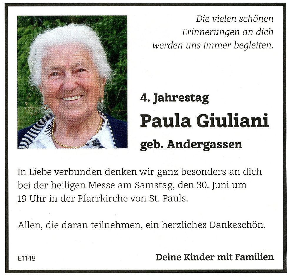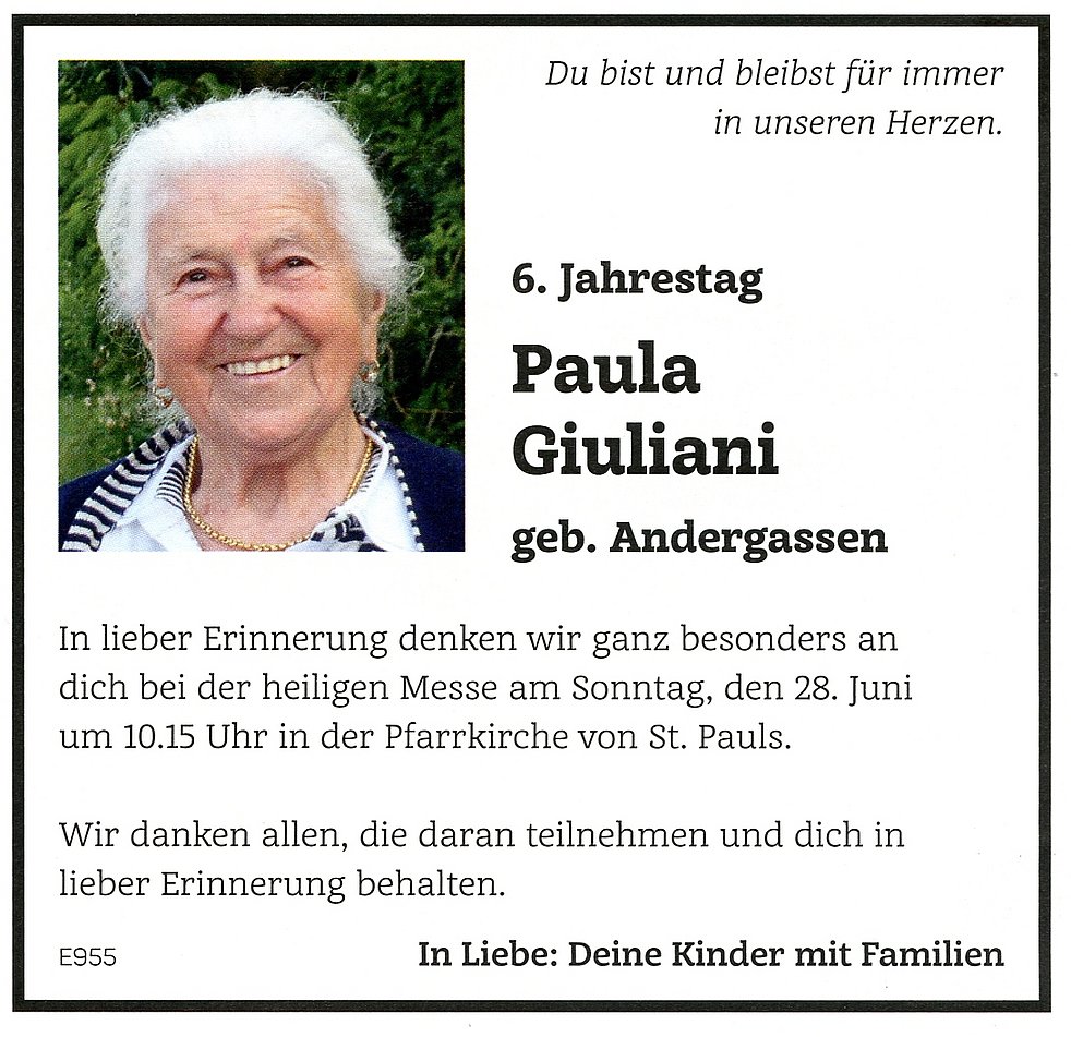 Wir begleiten unsere liebe Mutter am Donnerstag, den 3. Juli nach dem Trauergottesdienst, der um 16 Uhr beginnt, ausgehend von der Pfarrkirche St. Pauls zur letzten Ruhe in den Ortsfriedhof.