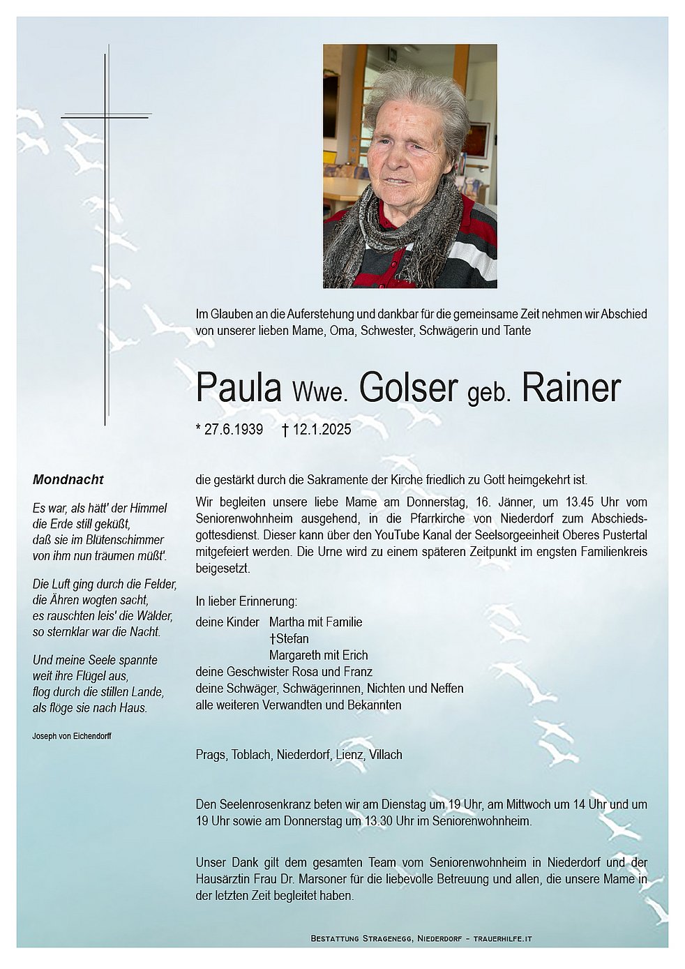 Liebe Frau Paula,wir erinnern uns sehr gerne an sie und an viele schöne gemeinsame Singstunden im Seniorenwohnheim von Niederdorf. Ihr sehr freundliches,zufriedenes und dankbares Wesen werden uns gut in Erinnerung bleiben. Gott möge ihnen eine neue Heimat bei ihm schenken.