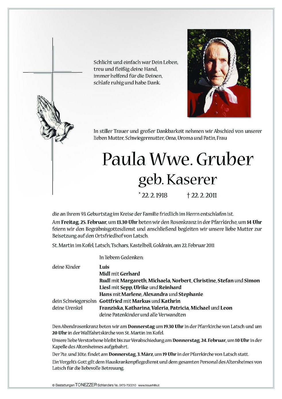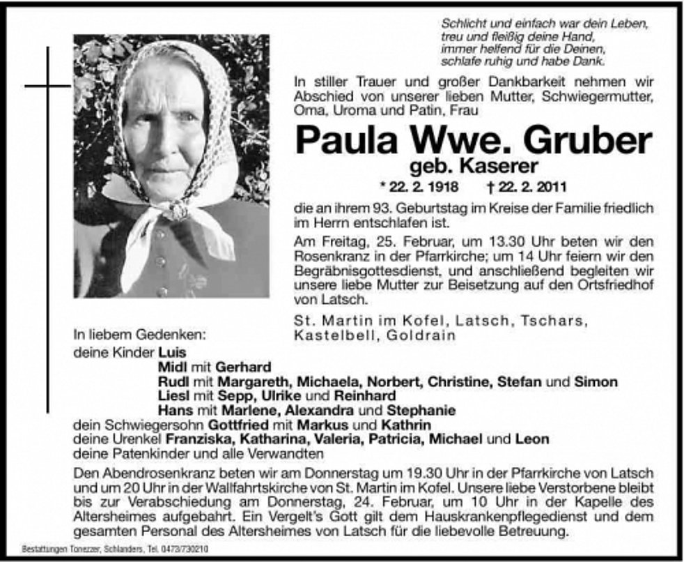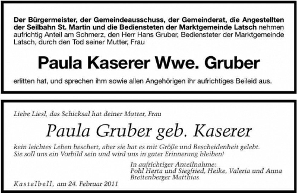 Am Freitag, 25. Februar, um 13.30 Uhr beten wir den Rosenkranz in der Pfarrkirche; um 14 Uhr feiern wir den Begräbnisgottesdienst und anschließend begleiten wir unsere liebe Mutter zur Beisetzung auf den Ortsfriedhof von Latsch.