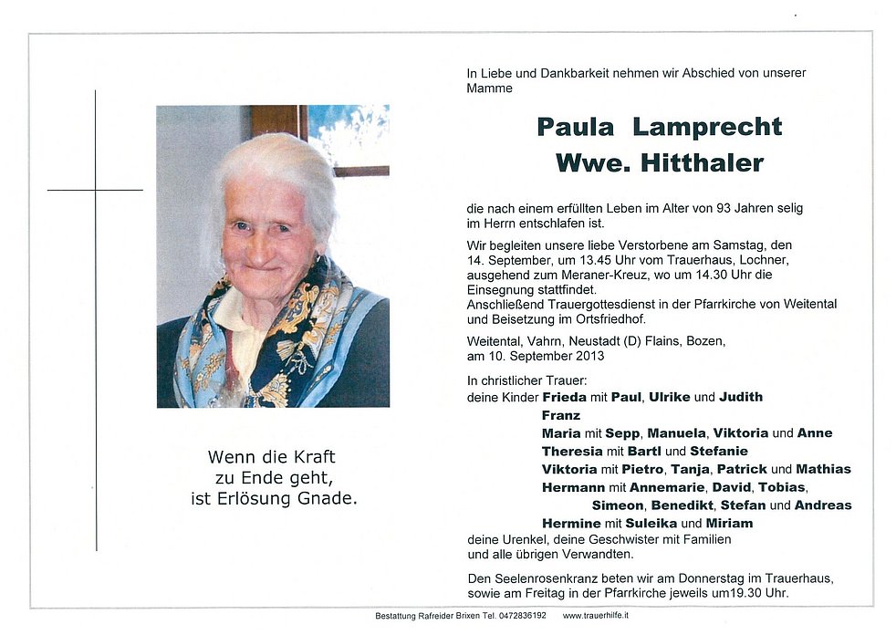 Wir begleiten unsere liebe Verstorbene am Samstag, den 14. September, um 13.45 Uhr vom Trauerhaus, Lochner, ausgehend zum Meraner-Kreuz, wo um 14.30 Uhr die Einsegnung stattfindet.