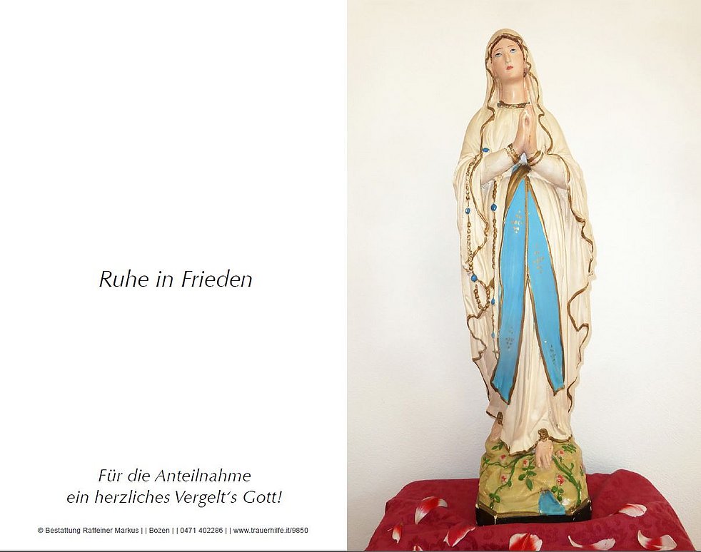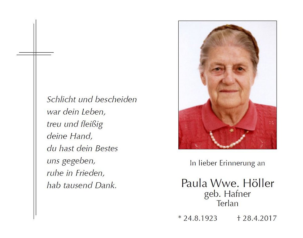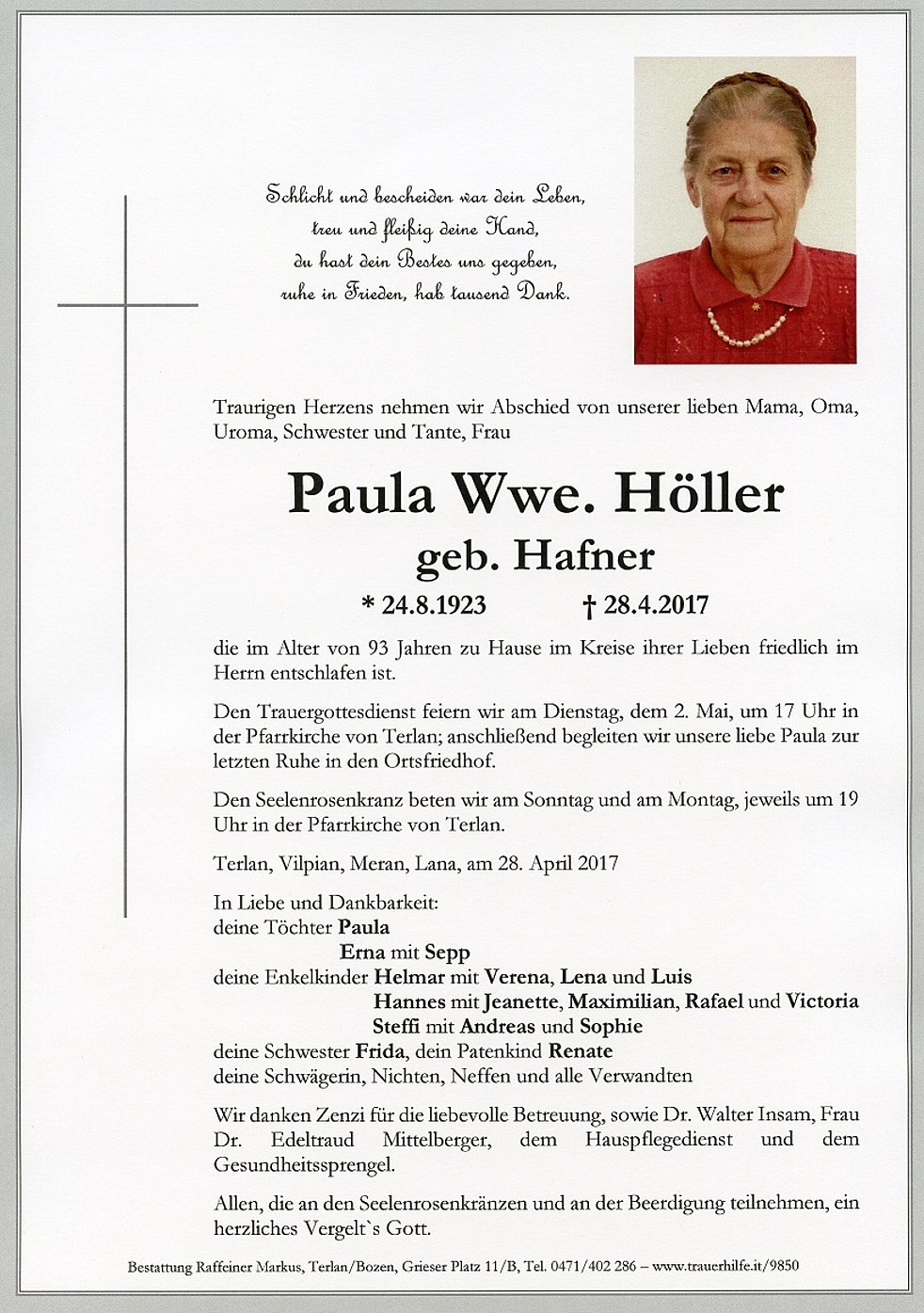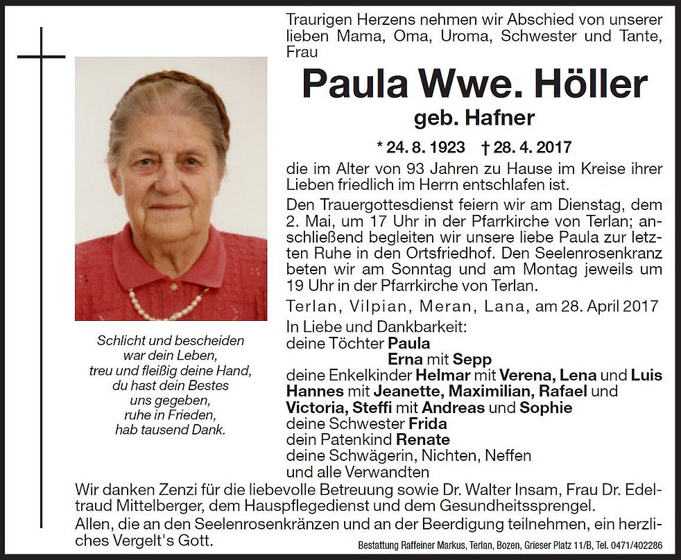 Den Trauergottesdienst feiern wir am Dienstag, dem 2. Mai, um 17 Uhr in der Pfarrkirche von Terlan; anschließend begleiten wir unsere liebe Paula zur letzten Ruhe in den Ortsfriedhof.