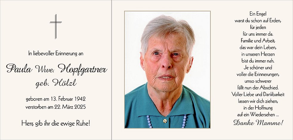 Unsere liebe Mamme ist ab Montagmittag in der Friedhofskapelle aufgebahrt. Den Seelenrosenkranz beten wir am Montag um 19.30 Uhr in der Friedhofskapelle und am Dienstag um 13.30 Uhr in der Pfarrkirche.
