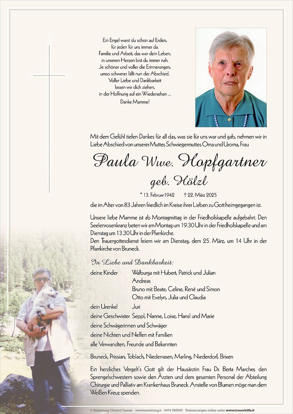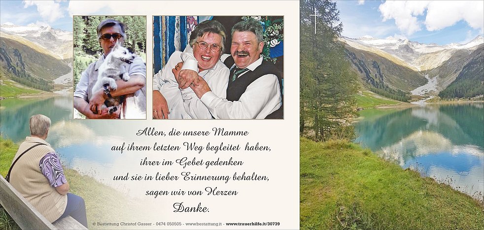 Ein herzliches Vergelt’s Gott gilt der Hausärztin Frau Dr. Berta Marcher, den Sprengelschwestern sowie den Ärzten und dem gesamten Personal der Abteilung Chirurgie und Palliativ am Krankenhaus Bruneck. Anstelle von Blumen möge man dem Weißen Kreuz spenden.