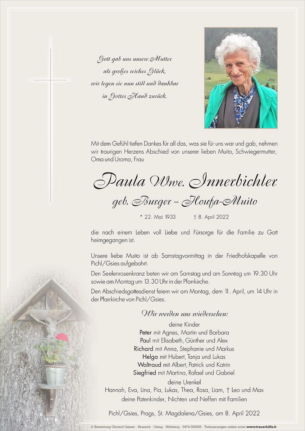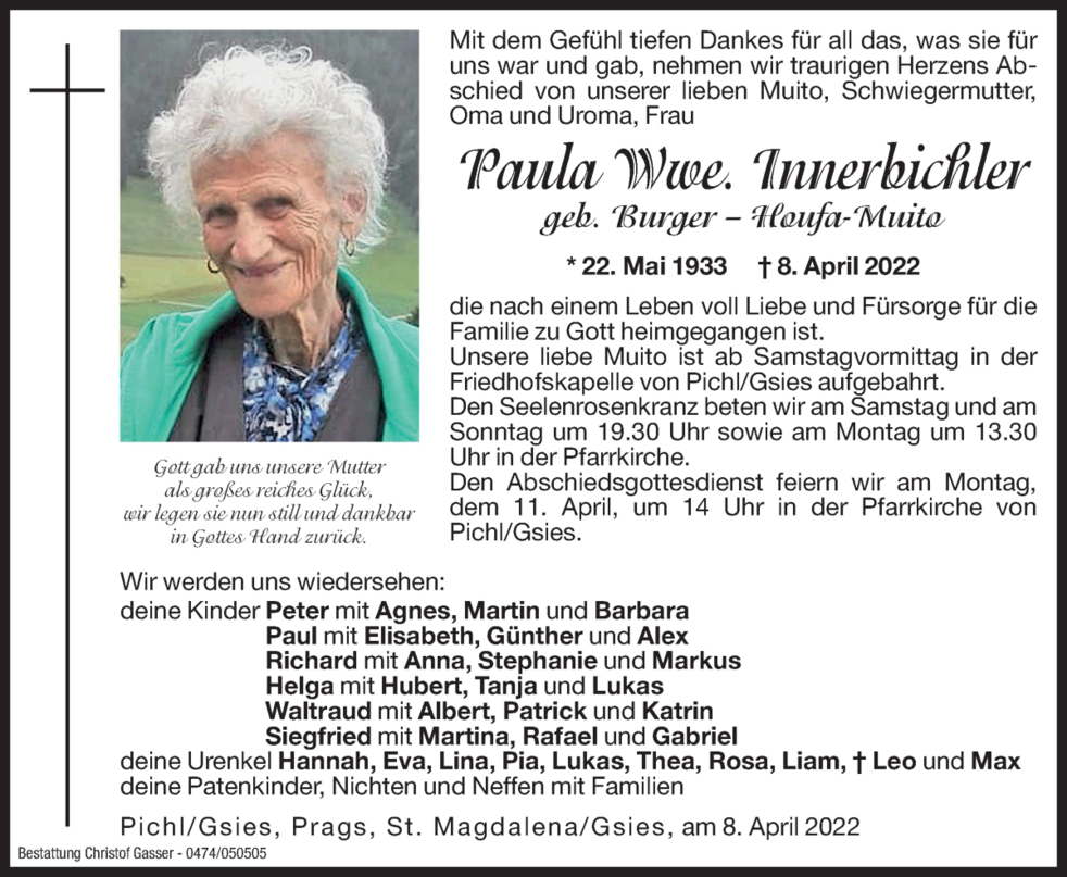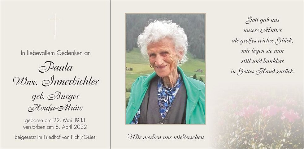 Heiter, lebensfroh und vielseitig interessiert blieb sie bis zuletzt. Am Schmerzensfreitag legte Paula ihr Leben in die Hände unseres Schöpfers zurück.