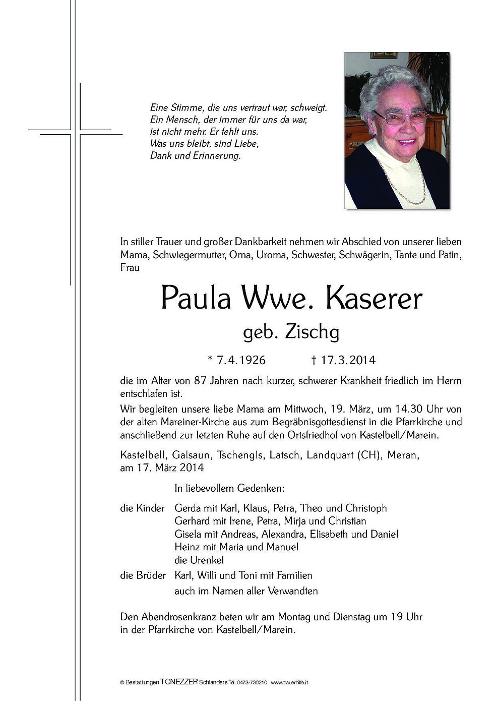 Wir begleiten unsere liebe Mama am Mittwoch, 19. März, um 14.30 Uhr von der alten Mareiner-Kirche aus zum Begräbnisgottesdienst in die Pfarrkirche und anschließend zur letzten Ruhe auf den Ortsfriedhof von Kastelbell/Marein.