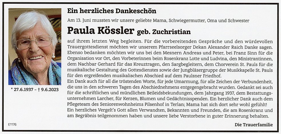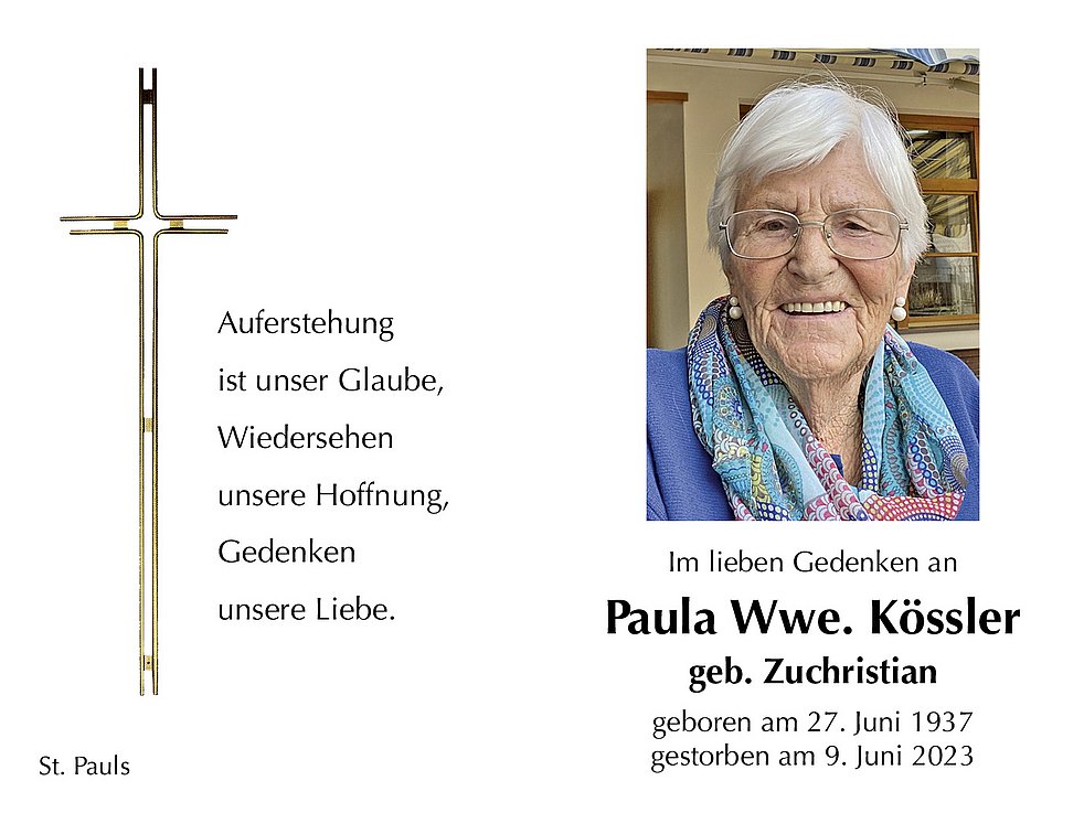 Den Trauergottesdienst feiern wir am Dienstag, den 13. Juni um 14.30 Uhr in der Pfarrkirche von St. Pauls. Anschließend begleiten wir unsere liebe Verstorbene auf den Ortsfriedhof.