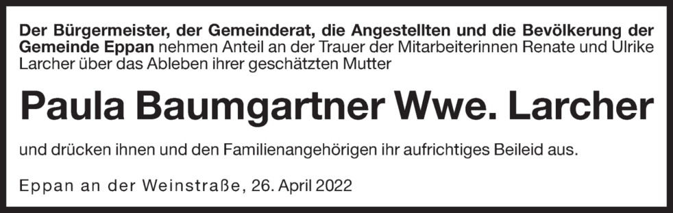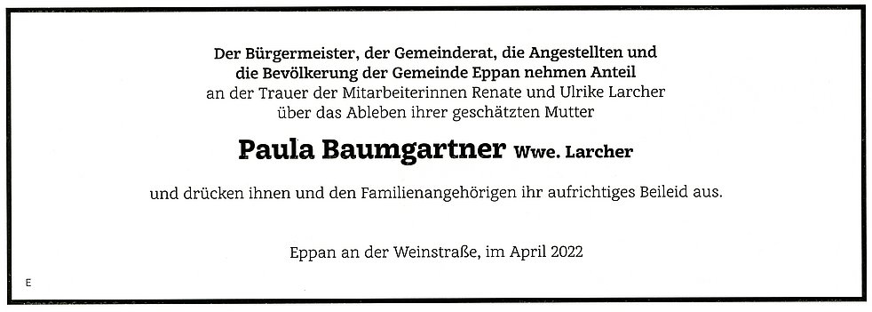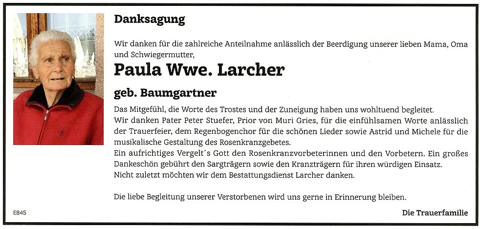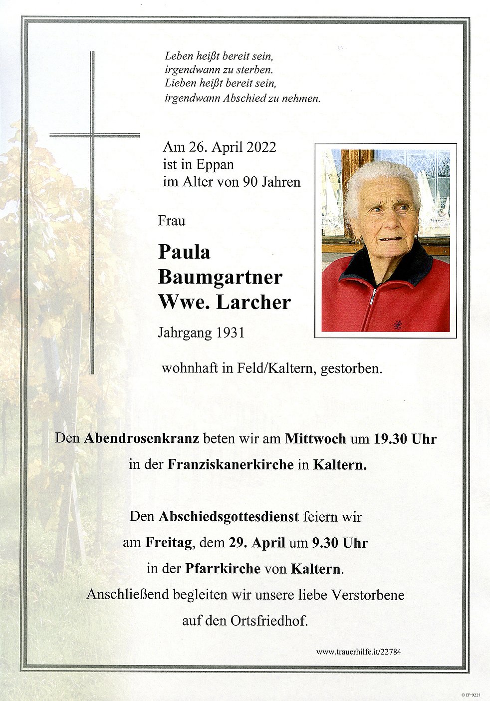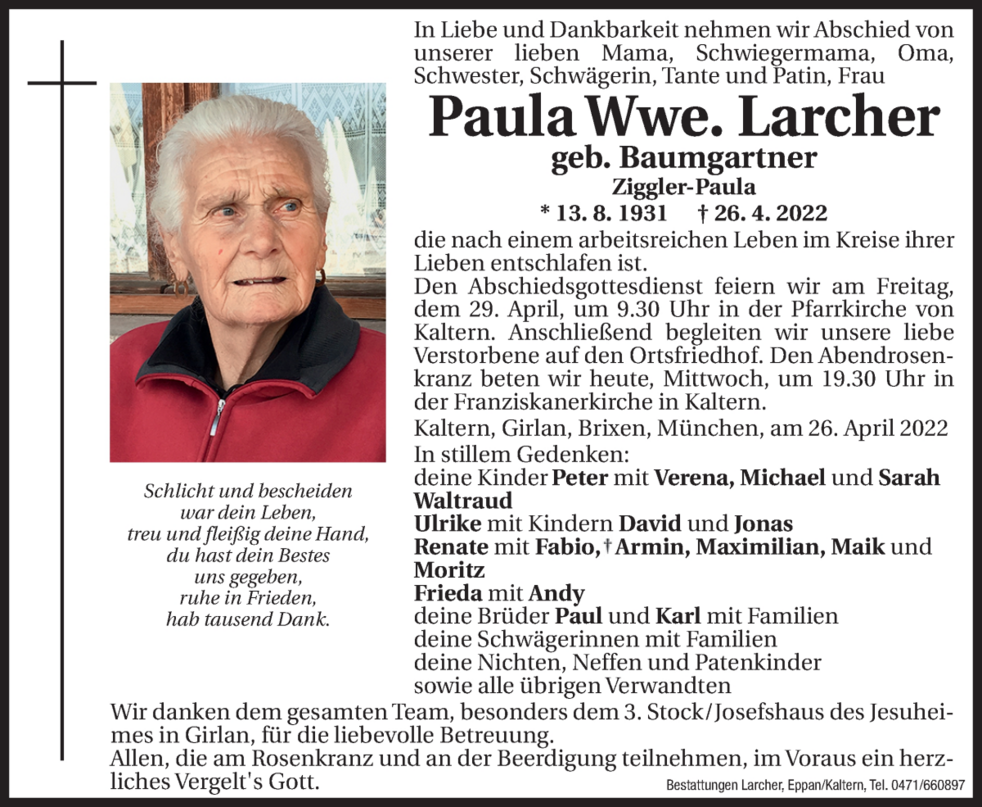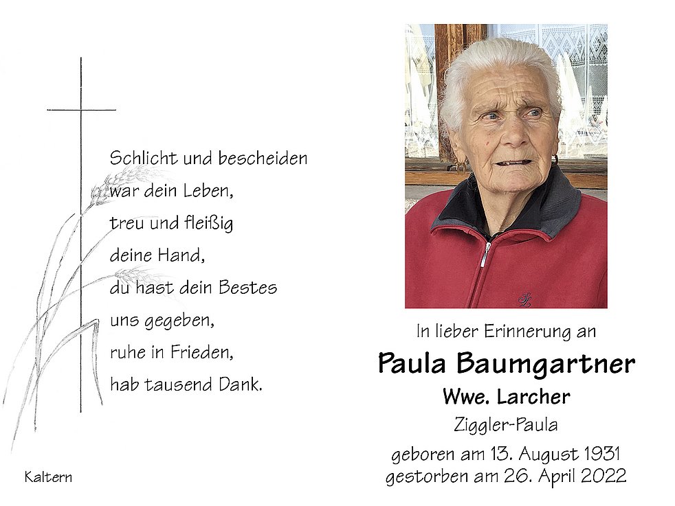 Den Abschiedsgottesdienst feiern wir am Freitag, dem 29. April um 9.30 Uhr in der Pfarrkirche von Kaltern. Anschließend begleiten wir unsere liebe Verstorbene auf den Ortsfriedhof.
