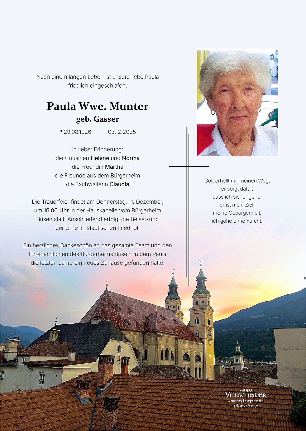 Begräbnisgottesdienst: 11.12. - 16:00 Uhr Bürgerheim Brixen